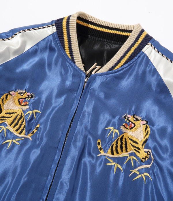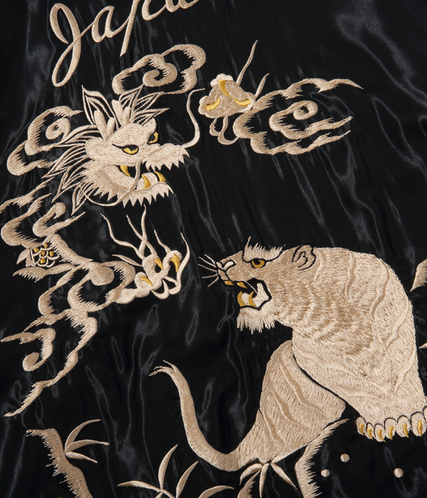 リバーシブル面は黒のボディに白を基調とした刺繍が施されているが、単色でありながら立体感のある刺繍の陰影で龍の鬣(たてがみ)や虎の毛並みが表現されており、当時も今も熟練の職人が手がけた逸品であることがわかる。