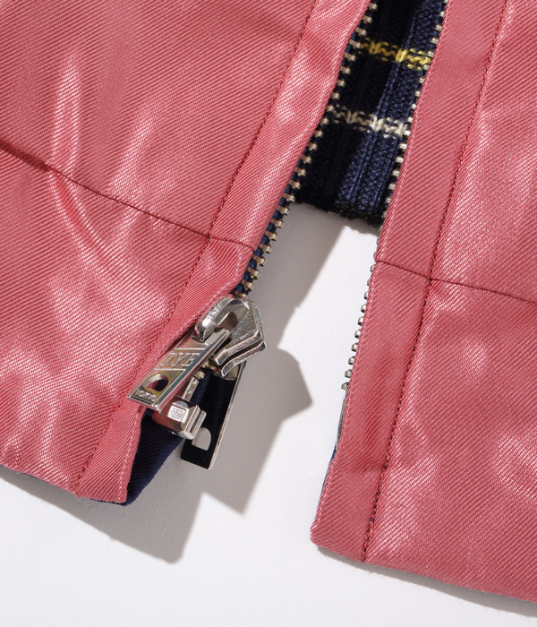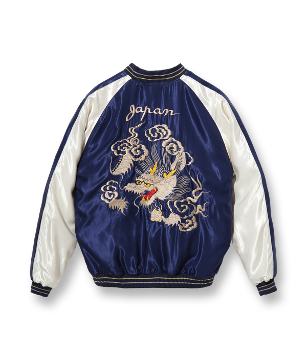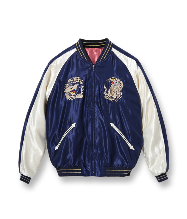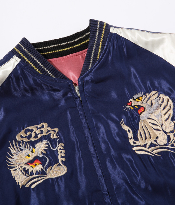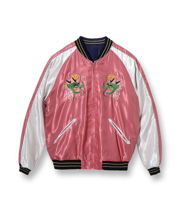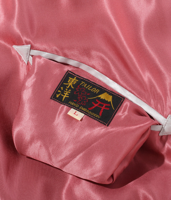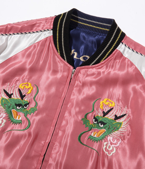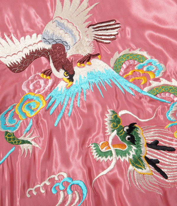 勇ましく翼を広げた鷲(わし)と富士山を抱え込むほど雄大な体躯を持つ龍が睨みあう壮大なスケールの作品。配色についても1950年代中期のヴィンテージを再現しており、ピンクのアセテート生地に負けない色鮮やかな刺繍が特徴。