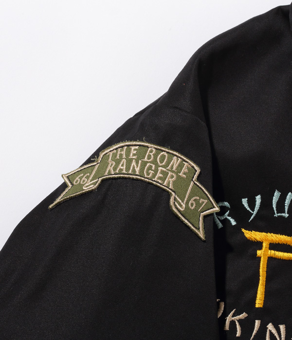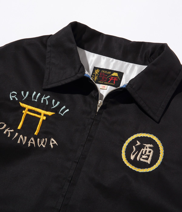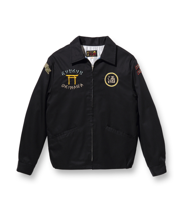 1966~1967年に沖縄に駐留していた米兵のカスタムオーダーで作られた「オキナワジャンパー」。首里城の守礼門とシーサーが沖縄の地図を挟むように刺繍された非常に珍しい絵柄となっている。地図の中心にある「KOZA」とは、米軍基地の門前町として栄えたコザ市のこと。ここは米兵向けの刺繍屋の集まる地域であった。スカジャンと同じく色鮮やかなレーヨン糸の横振り刺繍で描かれた絵柄は、ブラックのボディにネオンサインのように映え、当時の米兵はこのようなジャケットを部隊で揃えてオーダーし、夜の街に繰り出していた。