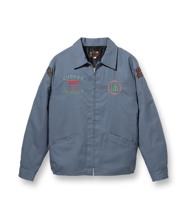 1966~1967年に沖縄に駐留していた米兵のカスタムオーダーで作られた「オキナワジャンパー」。首里城の守礼門とシーサーが沖縄の地図を挟むように刺繍された非常に珍しい絵柄となっている。地図の中心にある「KOZA」とは、米軍基地の門前町として栄えたコザ市のこと。ここは米兵向けの刺繍屋の集まる地域であった。スカジャンと同じく色鮮やかなレーヨン糸の横振り刺繍で描かれた絵柄は、ブラックのボディにネオンサインのように映え、当時の米兵はこのようなジャケットを部隊で揃えてオーダーし、夜の街に繰り出していた。