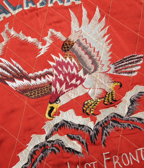 ベースとなっているのはアラスカをモチーフにした1950年代後期の貴重なヴィンテージ。遠方にデナリ(マッキンリー山)を望み、氷山の上空を羽ばたくホワイトイーグルが横振り刺繍で描かれている。