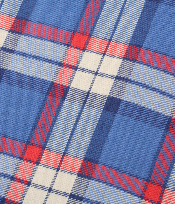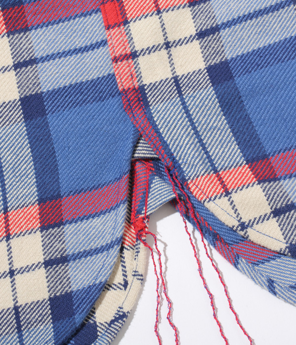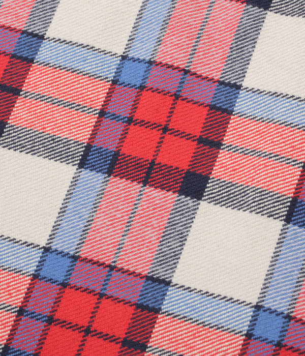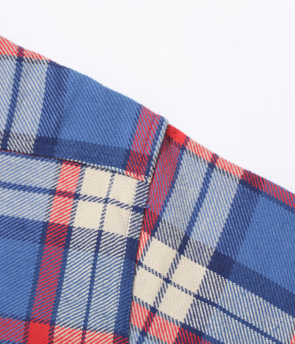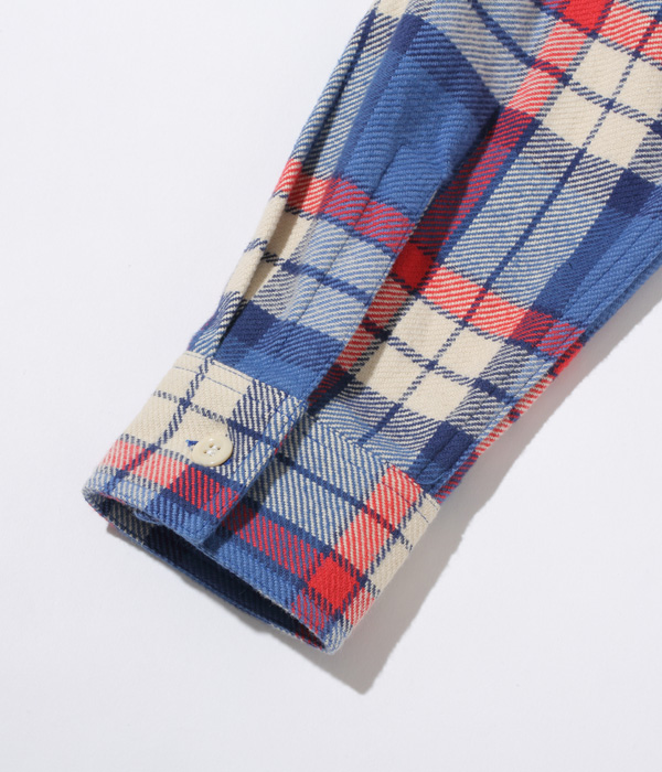 1970年代のJ.C.Penney / BIG MACのシャツから起こした経4色×緯4色の大柄のチェックシャツ。ヴィンテージをベースに、2本針巻き縫いの縫製や各部の仕様など、1950〜60年代のディテールを再現している。経糸に20番手双糸、緯糸に10番手単糸を使い、糸の打ち込みをしっかりと入れたハリのあるツイル生地を使用。あまり使い込まれていないコンディションのものから色目をピックアップした。