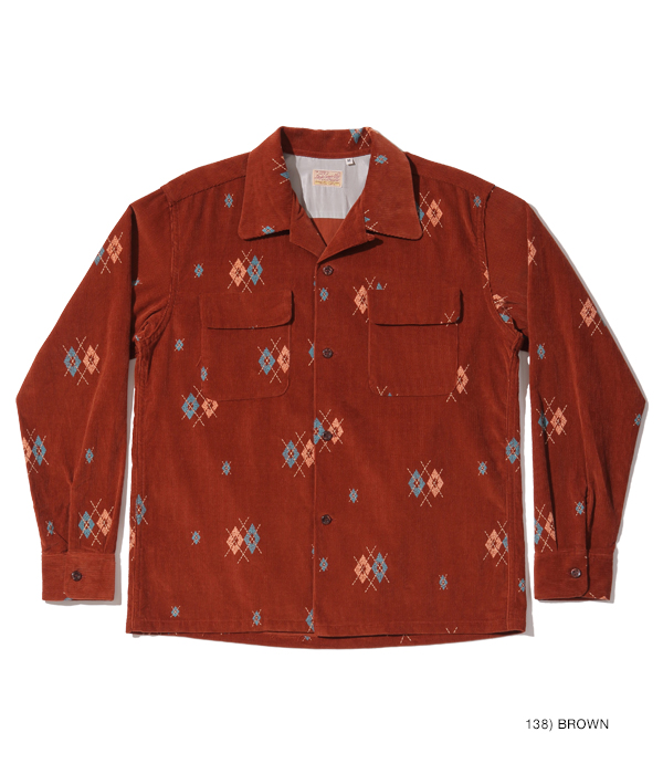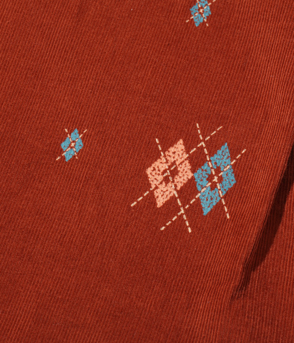 アーガイル柄は50sカルチャーにおいて高い人気を誇る。それゆえ様々なパターンが存在するが、なかでもこのような無地部分の多いアーガイル柄は珍しい。ヴィンテージでは1950年代中期のレーヨンギャバジン生地のジップアップジャケットにみられる絵柄をコーデュロイスポーツシャツへと落とし込んでいる。