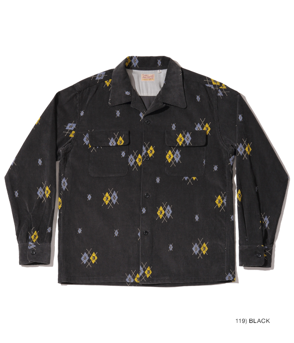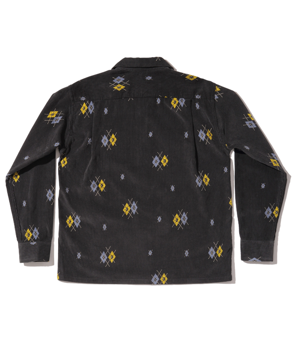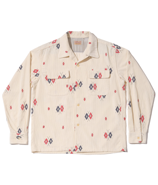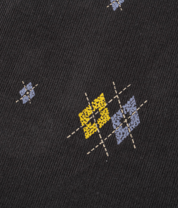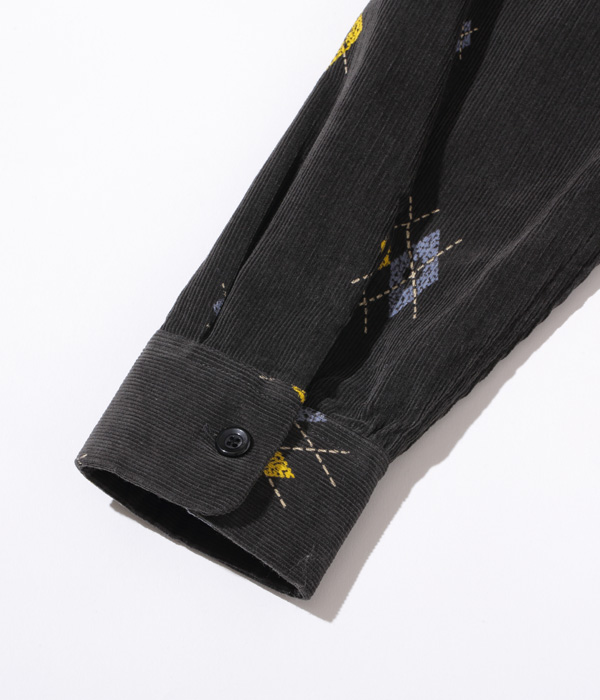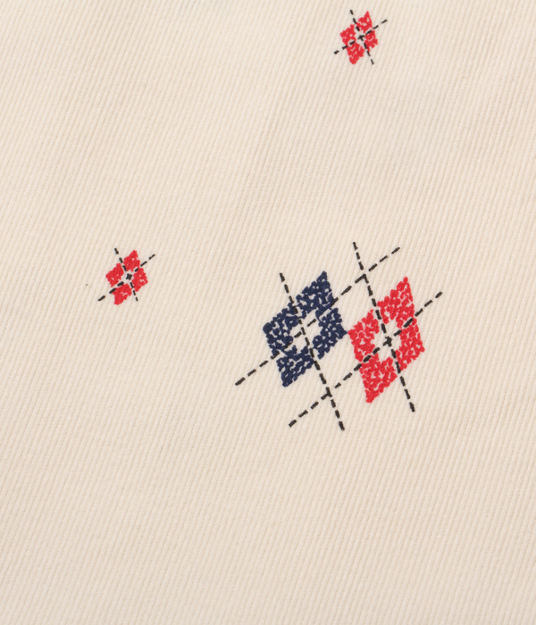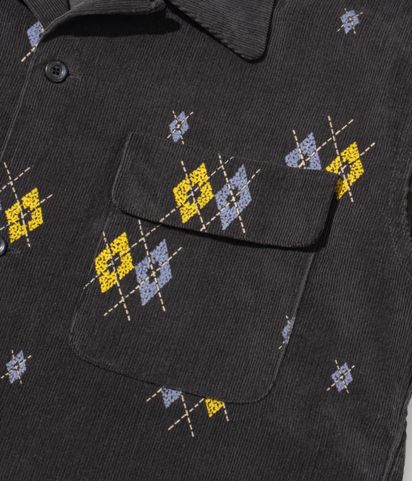 アーガイル柄は50sカルチャーにおいて高い人気を誇る。それゆえ様々なパターンが存在するが、なかでもこのような無地部分の多いアーガイル柄は珍しい。ヴィンテージでは1950年代中期のレーヨンギャバジン生地のジップアップジャケットにみられる絵柄をコーデュロイスポーツシャツへと落とし込んでいる。