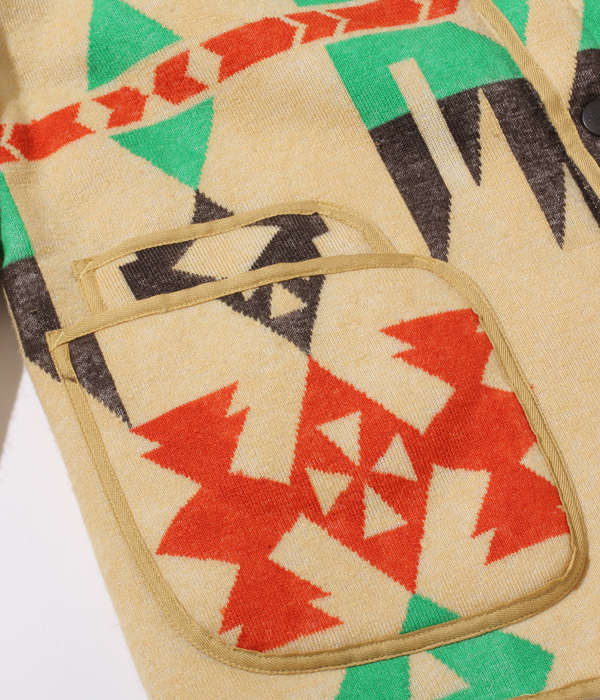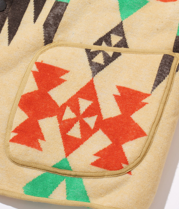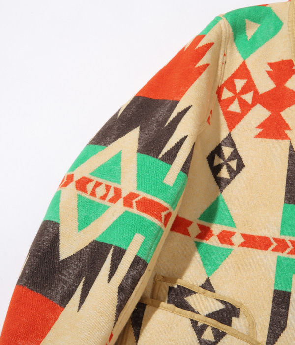型は1950年代のビーチクロス生地を使用したジャケットをベースとしており、独特な形状のスナップボタン、生地の端や縫製部に見られるヘリンボーン生地のパイピングが特徴。ウールブランケット同様、決まった箇所に柄が出るよう図入れをしているため、縫製には職人の技量を要する。またこちらのモデルはボアを内側に配していることで空気の層を多く含み、軽やかで高い保温性を誇る。