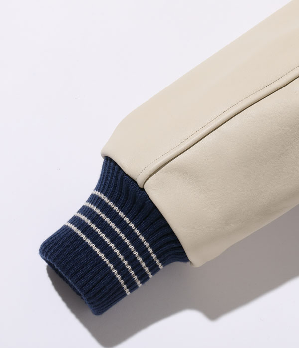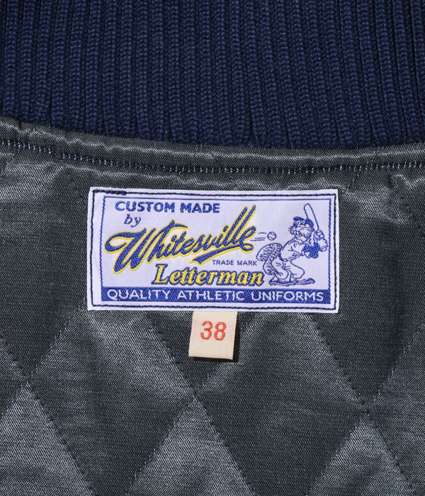 30オンスのウールメルトンとステアハイドを使用した頑丈なアワードジャケットのスタイルは1930年代に確立された。こちらは輝かしい戦績を残すごとに装飾を増やしていくアワードジャケットのベースとなる一着で、左胸に所属するチームの頭文字を記している。ここからチームメイトと出場する様々な大会での受賞歴や卒業年度などが、身頃や袖に縫い付けられていくことだろう。