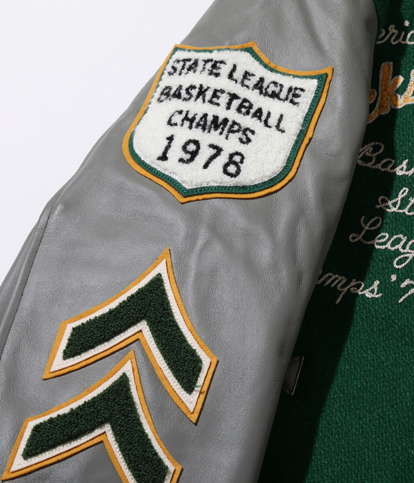グリーン×グレーのボディに対し、イエローのチェーン刺繍やリブのラインが全体のアクセントとなった一着。アワードジャケットが盛り上がりを見せた当時、スポーツマンたちは所属するチームや大会での記録を記したデコレーションを自身のジャケットに増やしていった。このジャケットからも、マーベリックスのメンバーが学生時代、スポーツに尽力していた姿を感じ取ることができる。