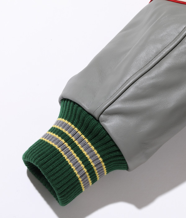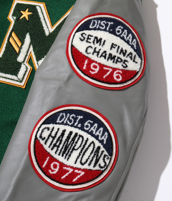 グリーン×グレーのボディに対し、イエローのチェーン刺繍やリブのラインが全体のアクセントとなった一着。アワードジャケットが盛り上がりを見せた当時、スポーツマンたちは所属するチームや大会での記録を記したデコレーションを自身のジャケットに増やしていった。このジャケットからも、マーベリックスのメンバーが学生時代、スポーツに尽力していた姿を感じ取ることができる。