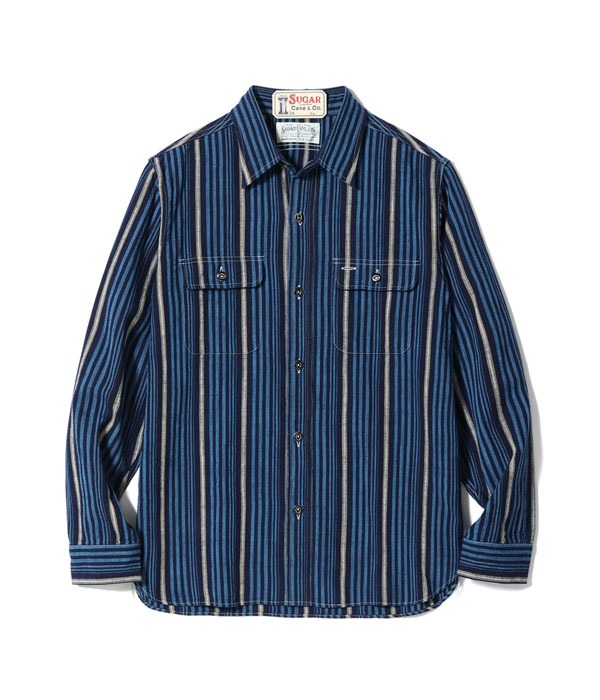 こちらはヴィンテージをもとにしたワークシャツ型。作業の効率化のため現代では省略されてしまったカーブした背ヨークや、補強の脇の力布が特徴。前立て裏や身返しにも贅沢にセルビッジを配しており、マーブルボタンとグラデーションラベルがネイビーボディのアクセントとなっている。