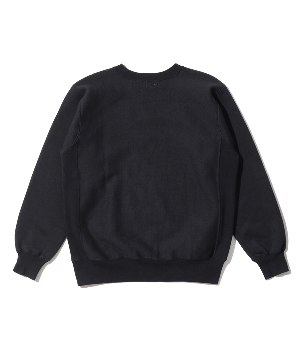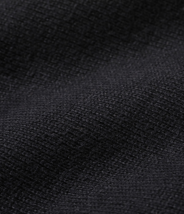 世界で唯一、日本の和歌山でしか稼動していない「吊り編み機」。この吊り編み機で製作できる限界の太さの糸を用いた「究極のヘビースウェット」をテーマに、表糸・中糸・裏糸を 8/10/3の糸番手で編み立てたエクストラヘビーホリゾンタルスウェット。他に類を見ない重みと厚みを持つ生地は1日に数メートルしか編み立てられないが、横使いで多くの生地を使用するのに加え、肩に継ぎ目が無いため編み立ててからネック部分をくり抜く贅沢な仕様。