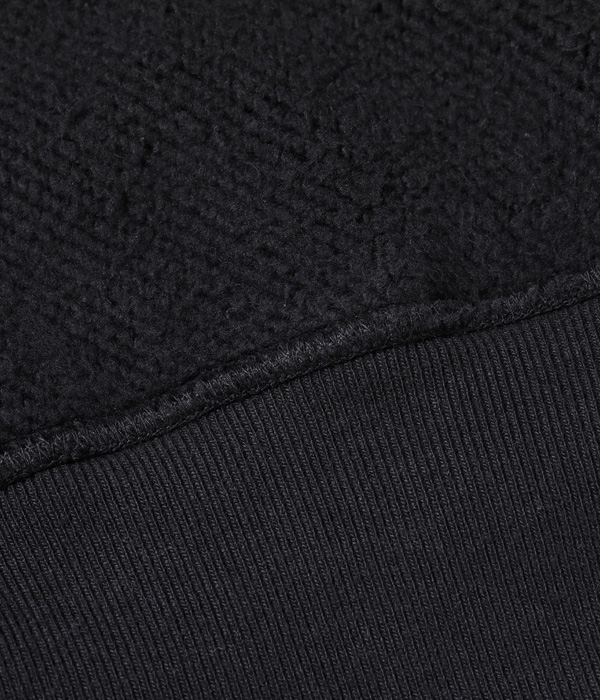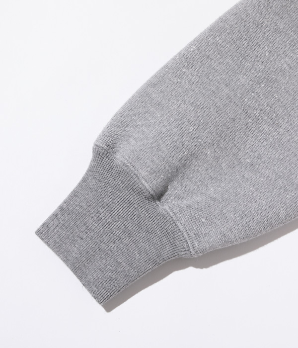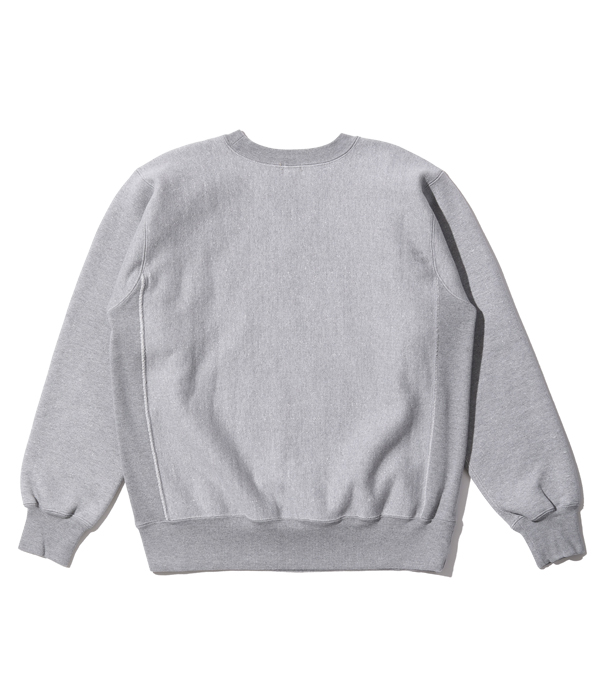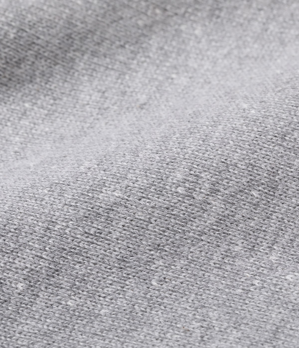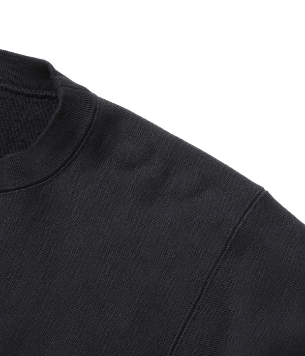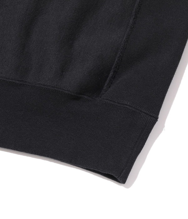 世界で唯一、日本の和歌山でしか稼動していない「吊り編み機」。この吊り編み機で製作できる限界の太さの糸を用いた「究極のヘビースウェット」をテーマに、表糸・中糸・裏糸を 8/10/3の糸番手で編み立てたエクストラヘビーホリゾンタルスウェット。他に類を見ない重みと厚みを持つ生地は1日に数メートルしか編み立てられないが、横使いで多くの生地を使用するのに加え、肩に継ぎ目が無いため編み立ててからネック部分をくり抜く贅沢な仕様。