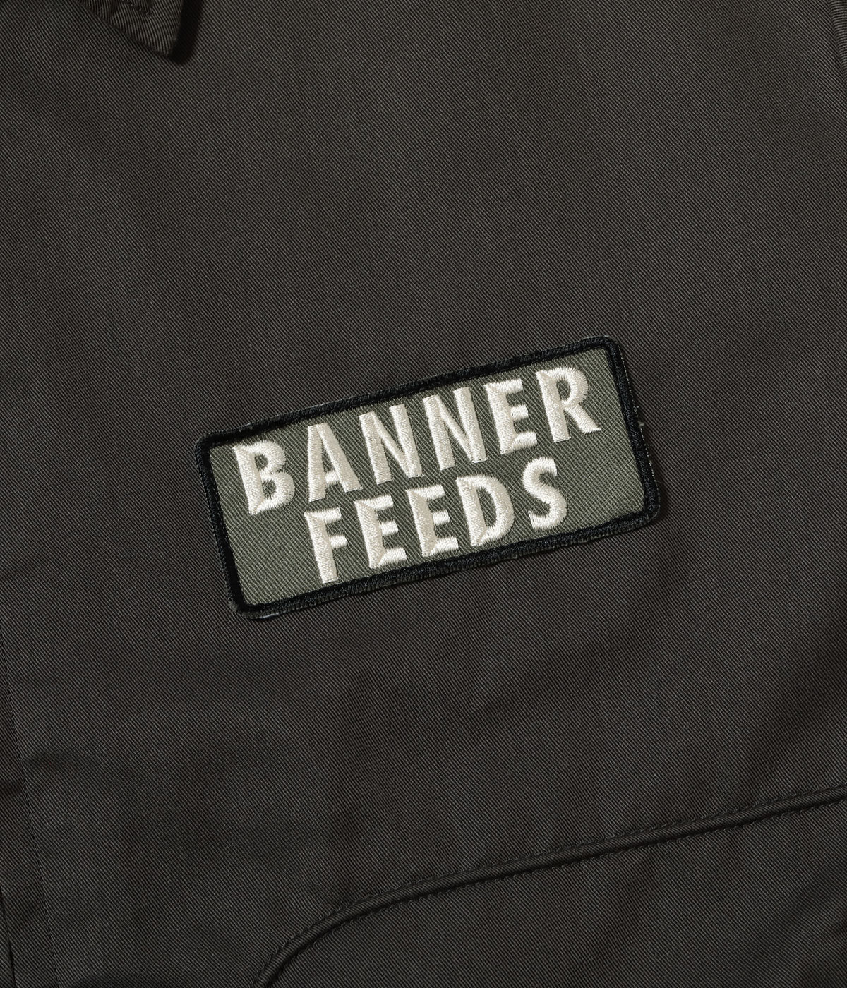 1970年代〜80年代のワークジャケットをイメージした家畜飼料メーカー「BANNER FEEDS」の企業ジャンパー。・背面にチェーン刺繍、左胸に横振り刺繍のワッペンで企業名を表現している。内容物が落下しにくい逆玉縁ポケットのほか、大容量の内ポケットも内蔵している。