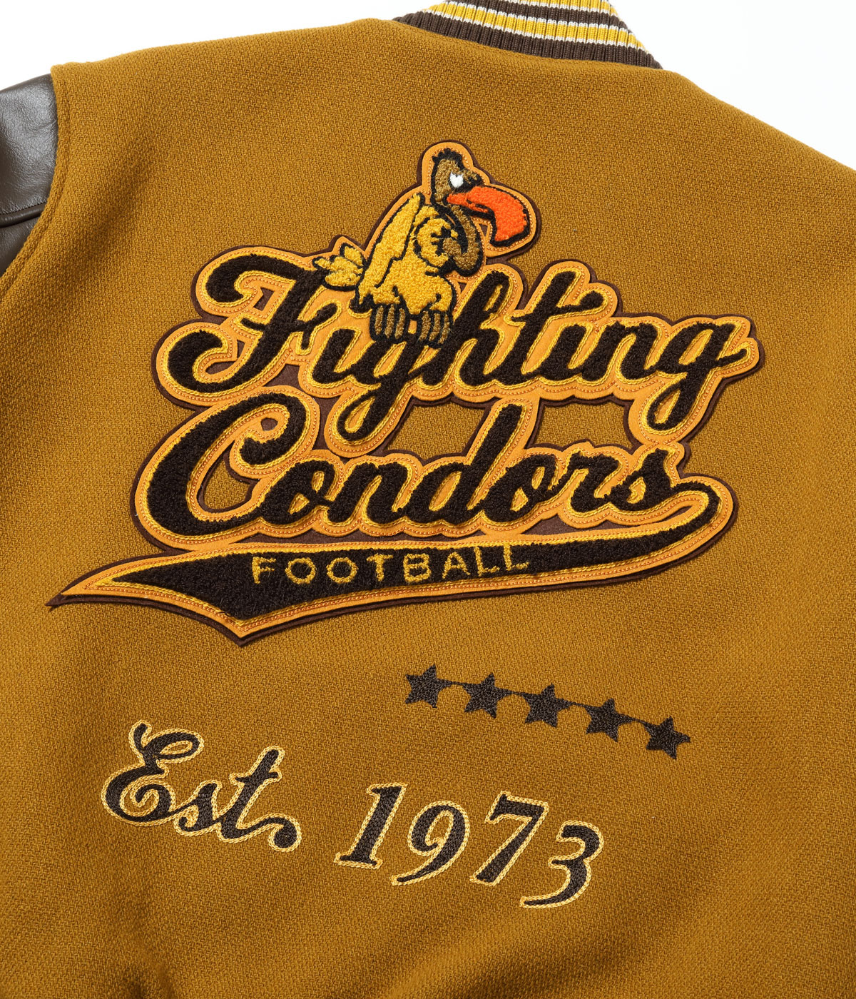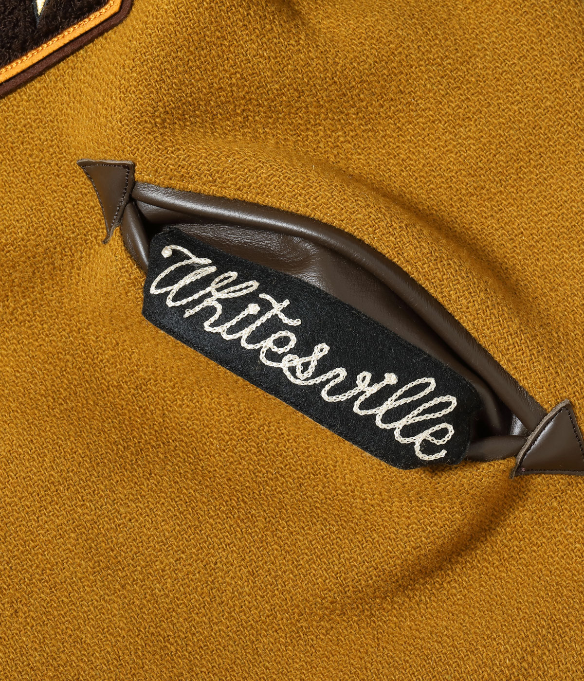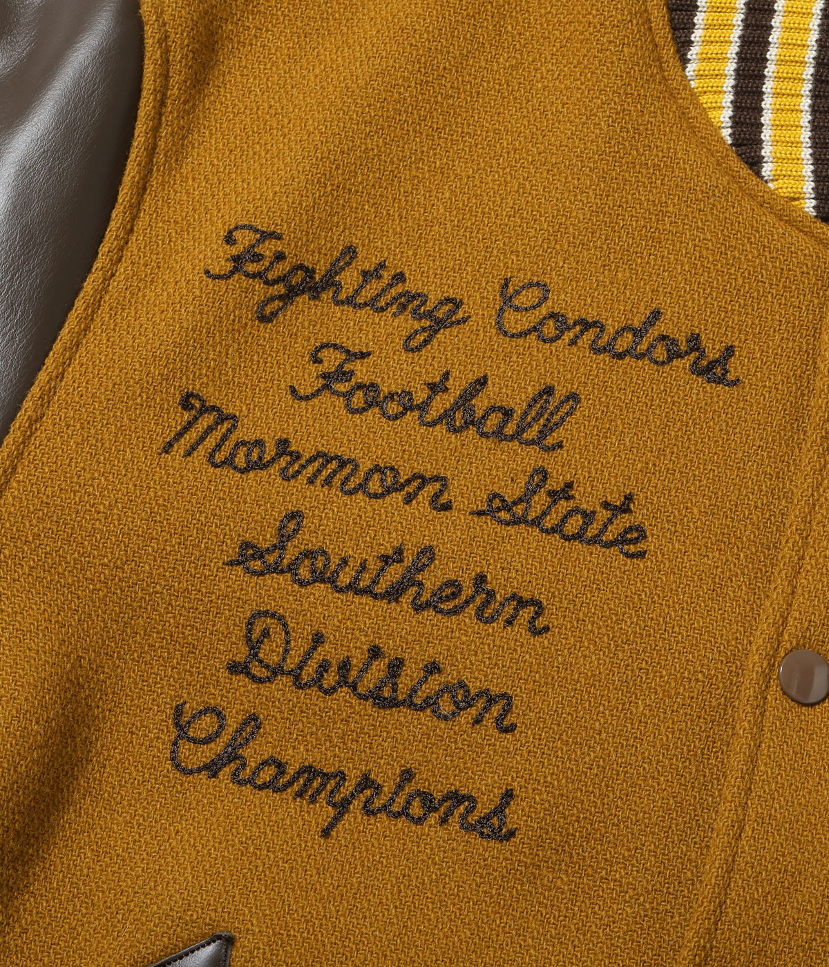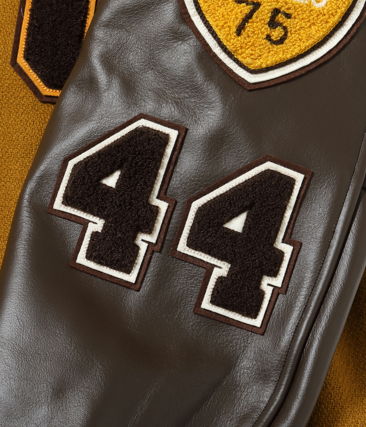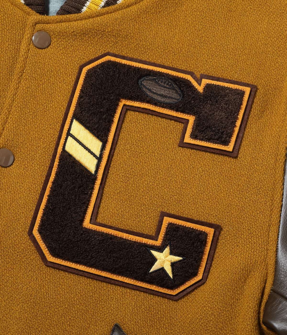 30オンスのウールメルトンとステアハイドを使った頑丈なアワードジャケットのスタイルは1930年代に確立された。以降、現代までそのスタイルは愛され続けている。この一着はゴールドとブラウンの配色で、クラシカルな雰囲気を醸し出している。またチェーン刺繍やシニールにも同系色を使用しており、統一感のある仕上がりとなっている。