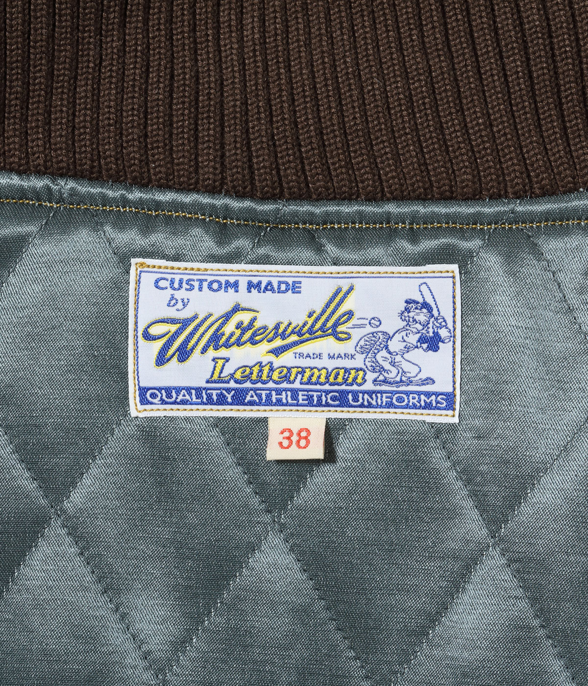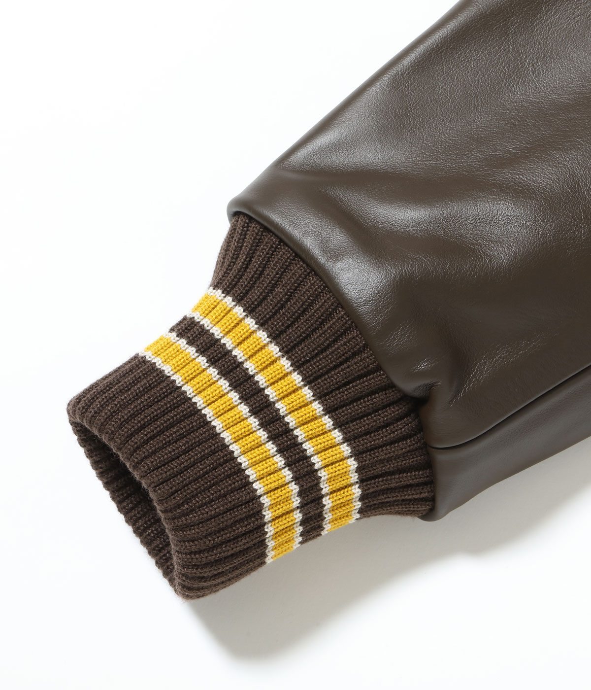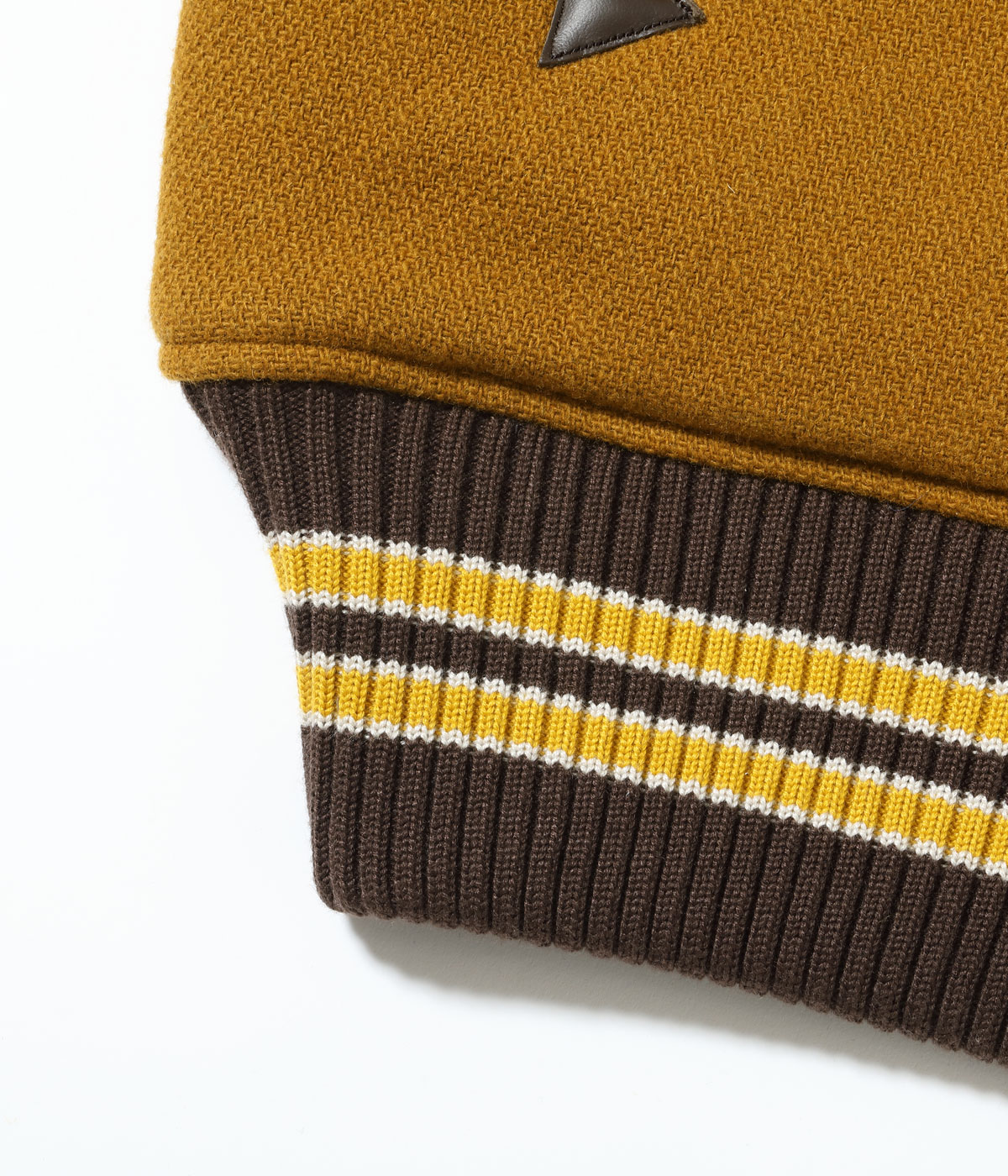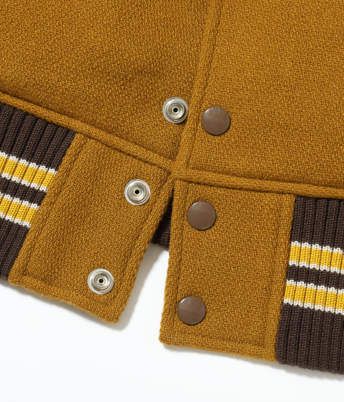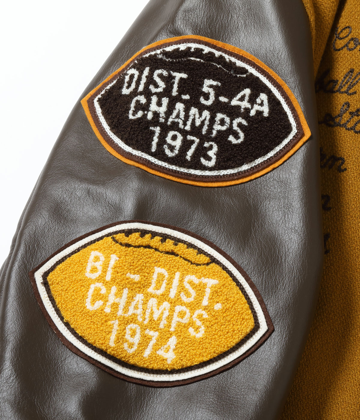 30オンスのウールメルトンとステアハイドを使った頑丈なアワードジャケットのスタイルは1930年代に確立された。以降、現代までそのスタイルは愛され続けている。この一着はゴールドとブラウンの配色で、クラシカルな雰囲気を醸し出している。またチェーン刺繍やシニールにも同系色を使用しており、統一感のある仕上がりとなっている。