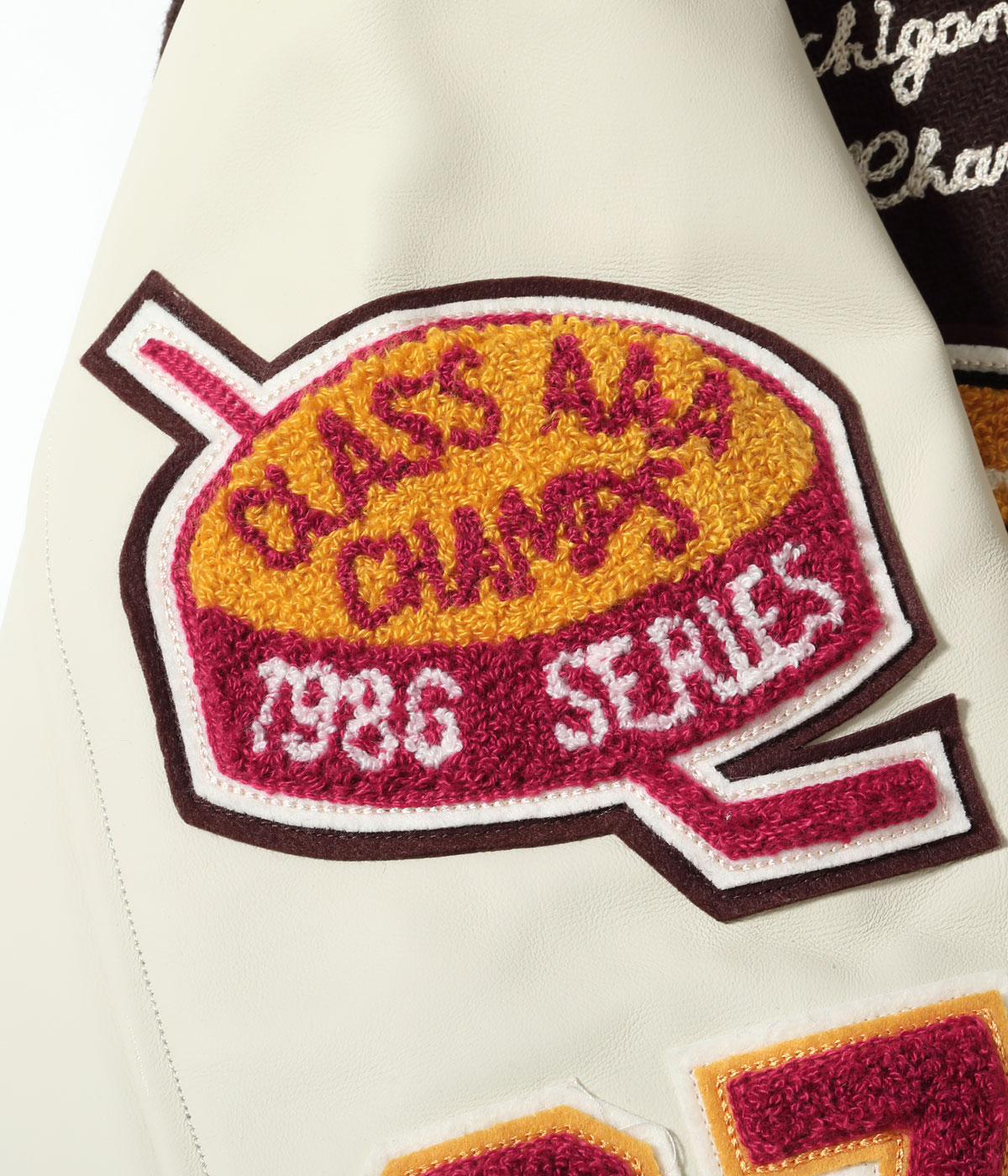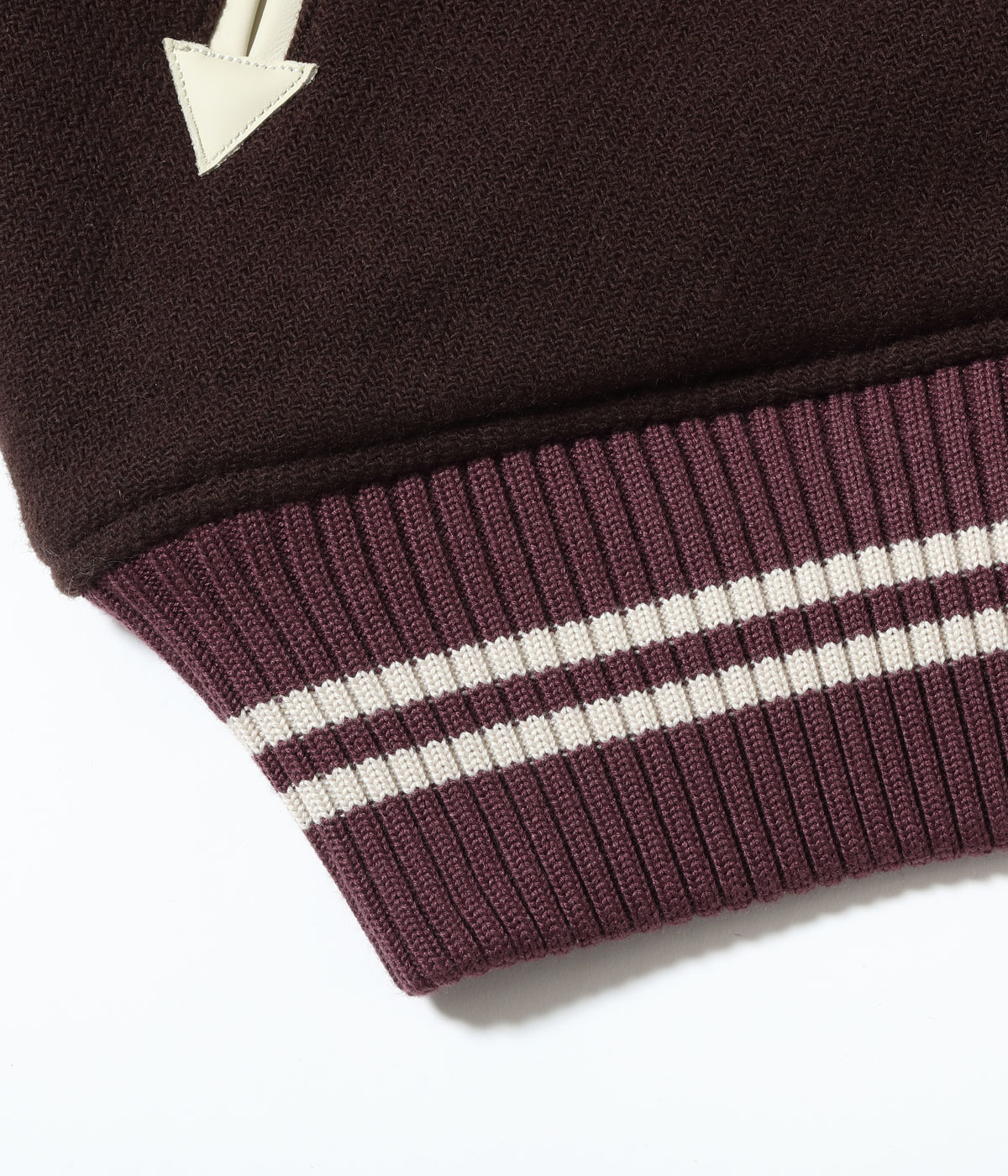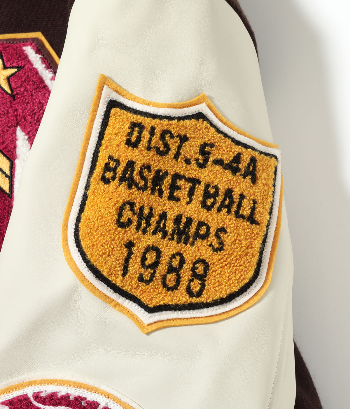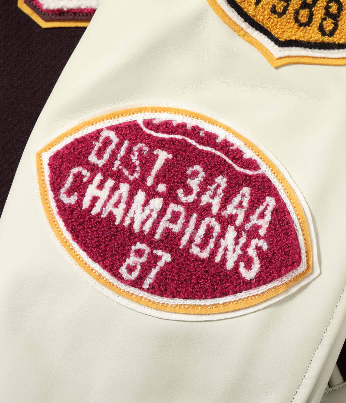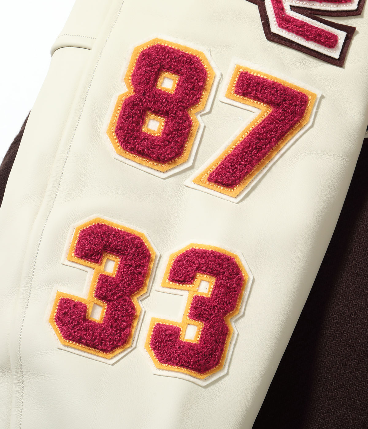 今季新色として展開したブラウンのボディにアイボリーの袖、マルーンのリブを組み合わせたクラシカルな雰囲気漂う一着。ボールやホッケーを模した数種類のスポーツのシニールが集約したアワードジャケットはヴィンテージでも珍しい。シニールや刺繍のカラーリングに統一感を持たせた、ファッション性の高いアワードジャケットに仕上がっている。