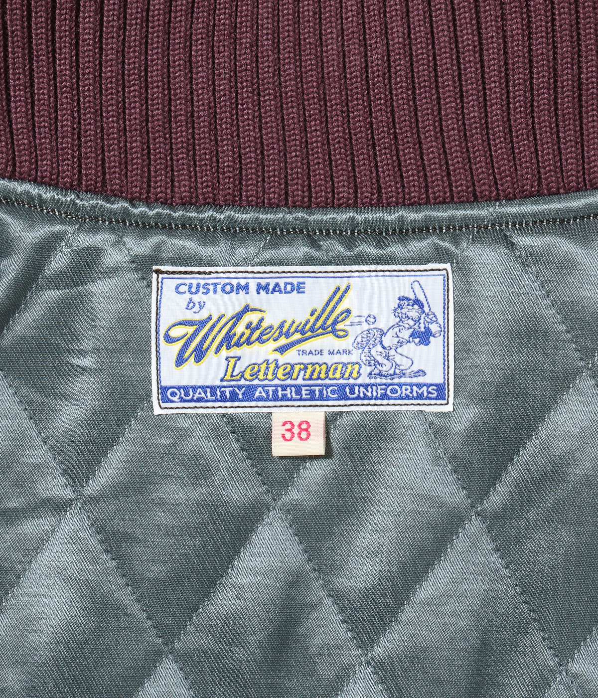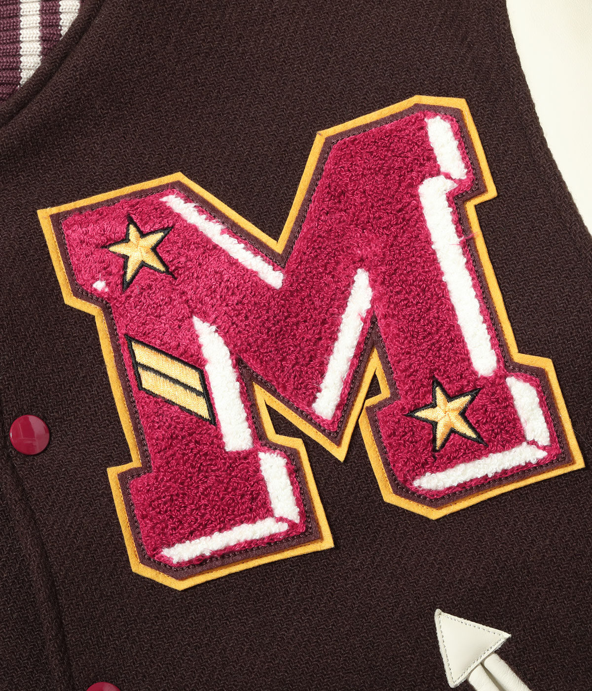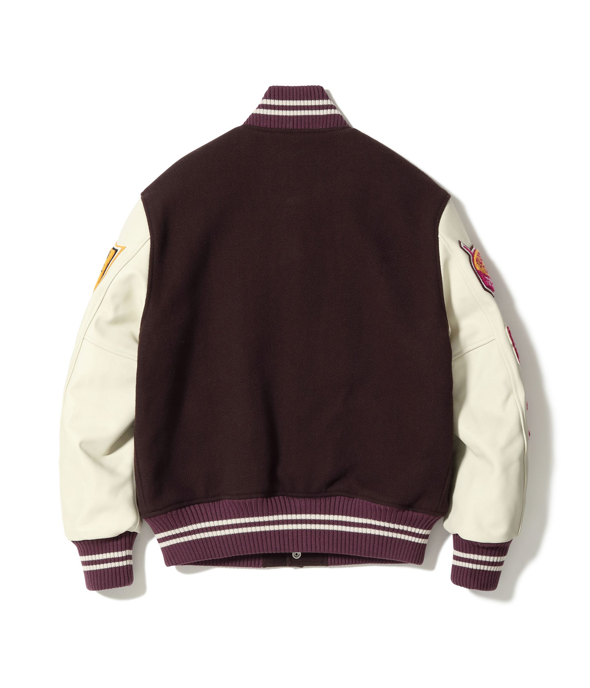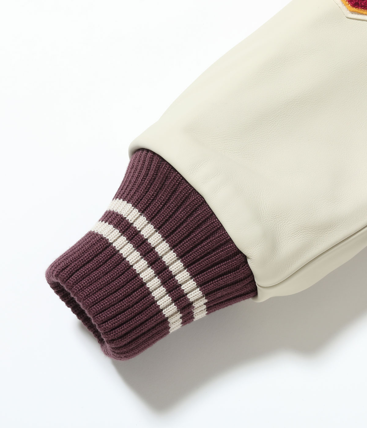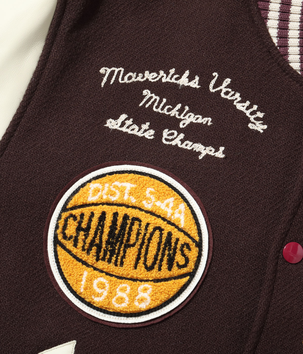 今季新色として展開したブラウンのボディにアイボリーの袖、マルーンのリブを組み合わせたクラシカルな雰囲気漂う一着。ボールやホッケーを模した数種類のスポーツのシニールが集約したアワードジャケットはヴィンテージでも珍しい。シニールや刺繍のカラーリングに統一感を持たせた、ファッション性の高いアワードジャケットに仕上がっている。
