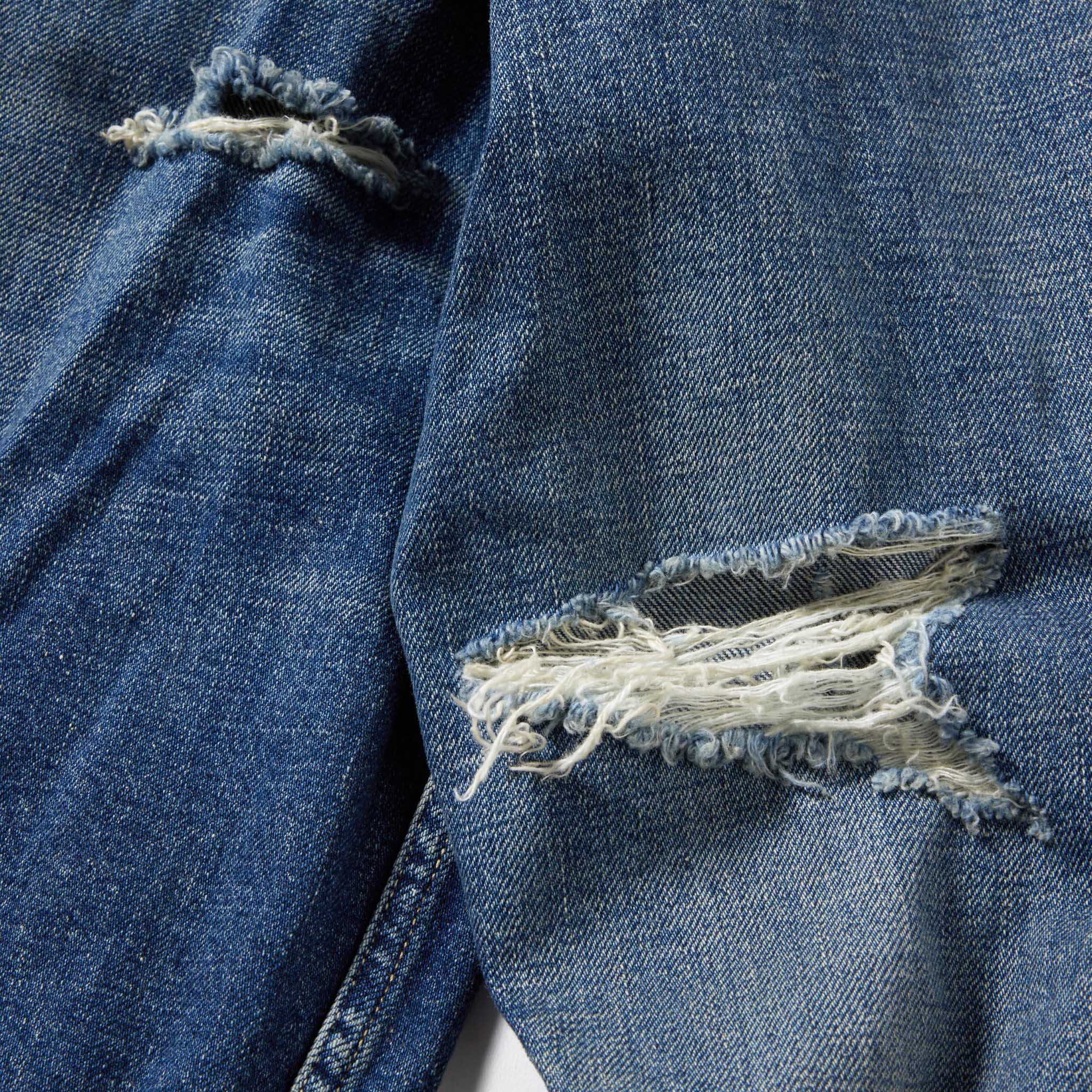 今季は1940年代のヴィンテージデニムジャケットをベースとし、使い勝手の良いハンドウォームポケットを配備。ヴィンテージでは大きいサイズにだけみられる、希少価値の高い背中心の接ぎ(スプリットバック)のディテールを全てのサイズに取り入れている。色落ちや汚れ、部分的にダメージの入ったヴィンテージ加工が施されている。