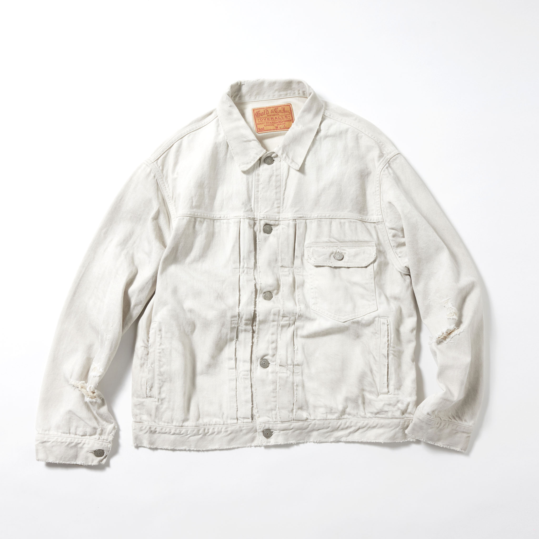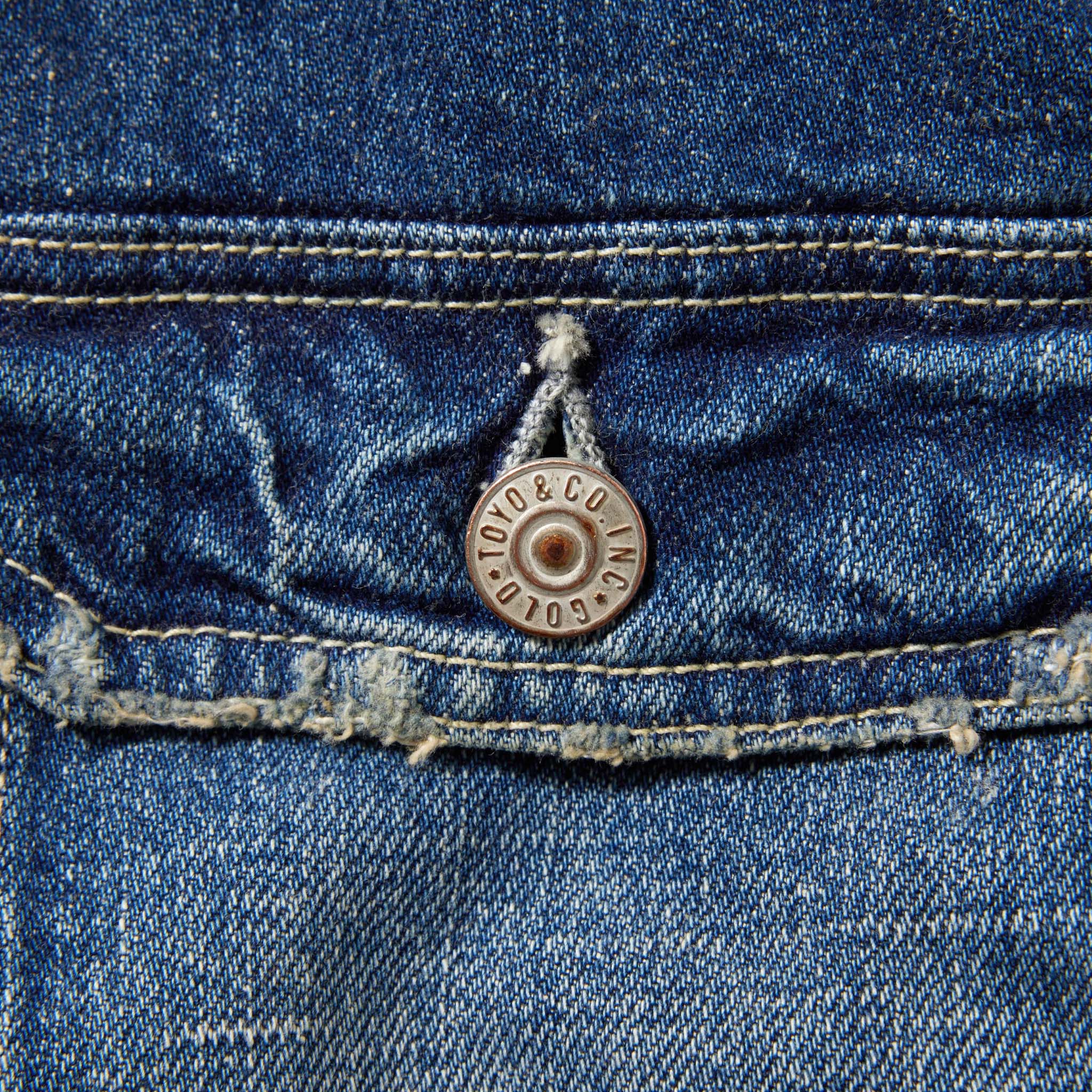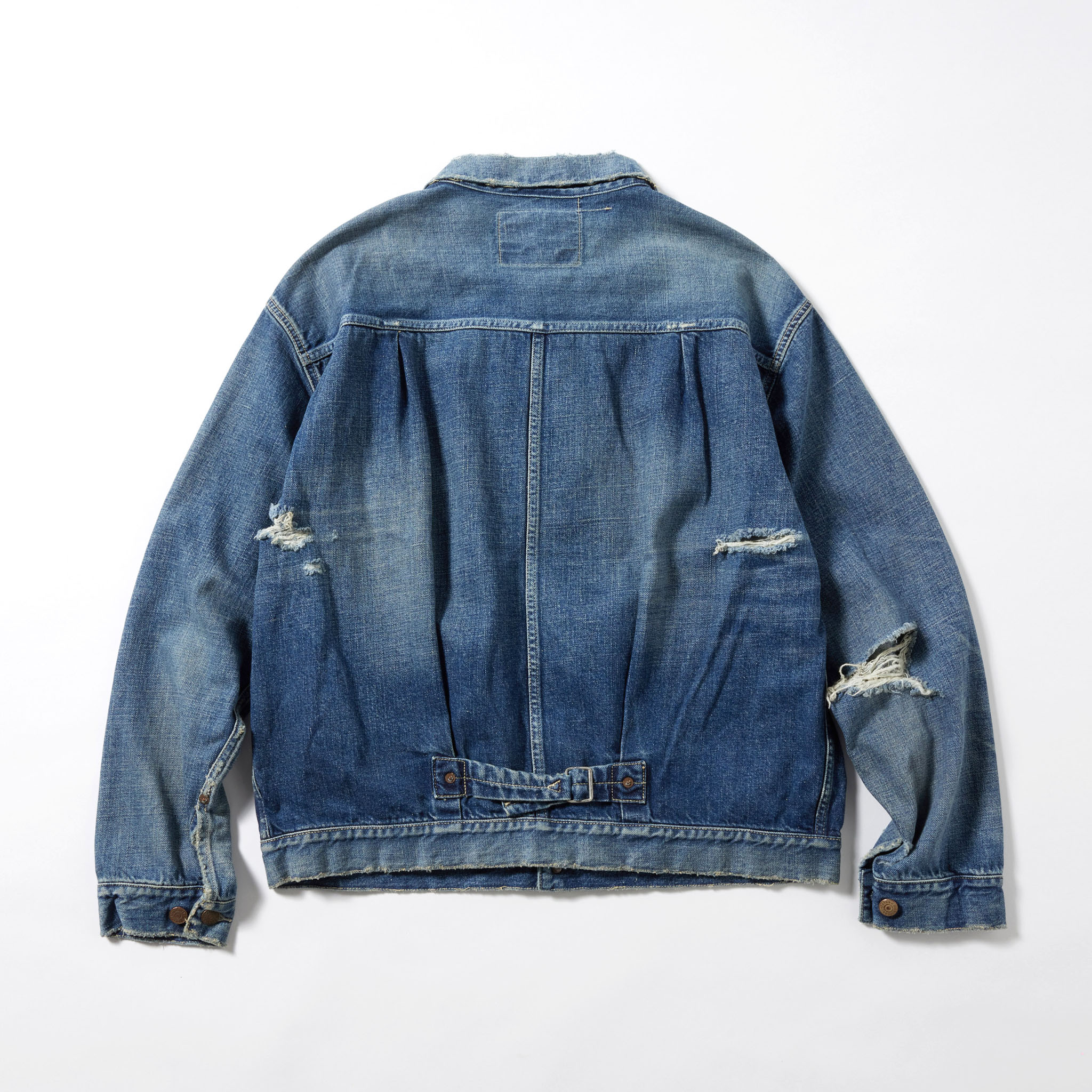 今季は1940年代のヴィンテージデニムジャケットをベースとし、使い勝手の良いハンドウォームポケットを配備。ヴィンテージでは大きいサイズにだけみられる、希少価値の高い背中心の接ぎ(スプリットバック)のディテールを全てのサイズに取り入れている。色落ちや汚れ、部分的にダメージの入ったヴィンテージ加工が施されている。