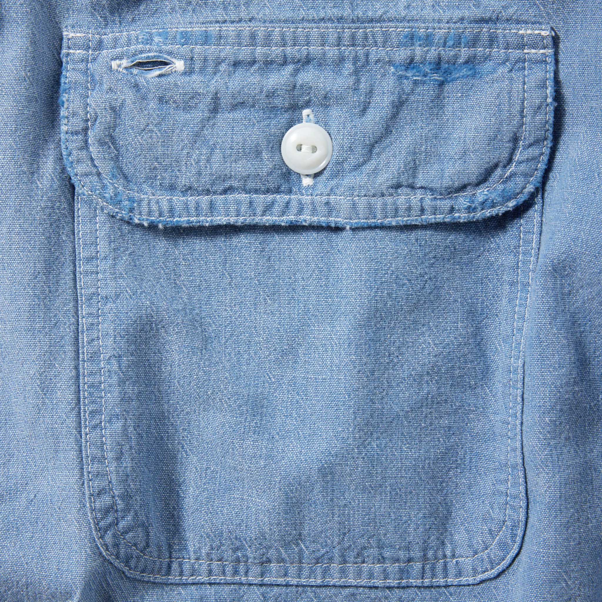 旧式のシャトル織機で織り上げられたセルビッジシャンブレー生地を使用。防縮加工を施さずに仕上げられ、製品洗いをすることで縮み、生地特有のザラ感や凹凸感が際立つ。定番のレギュラーシルエットのワークシャツはフラップ付きのポケットが採用されている。ブリーチ加工とダメージ加工を施した一着。