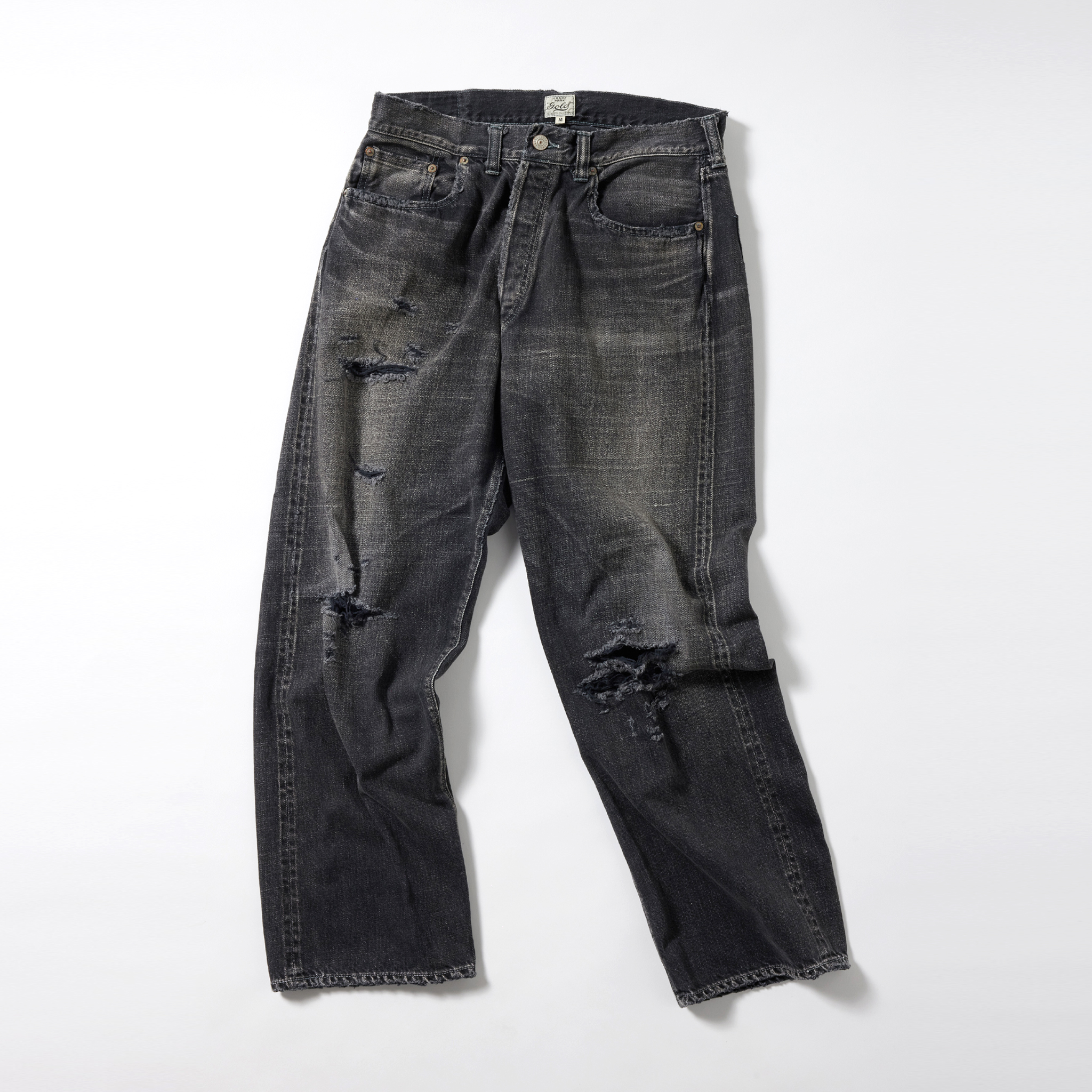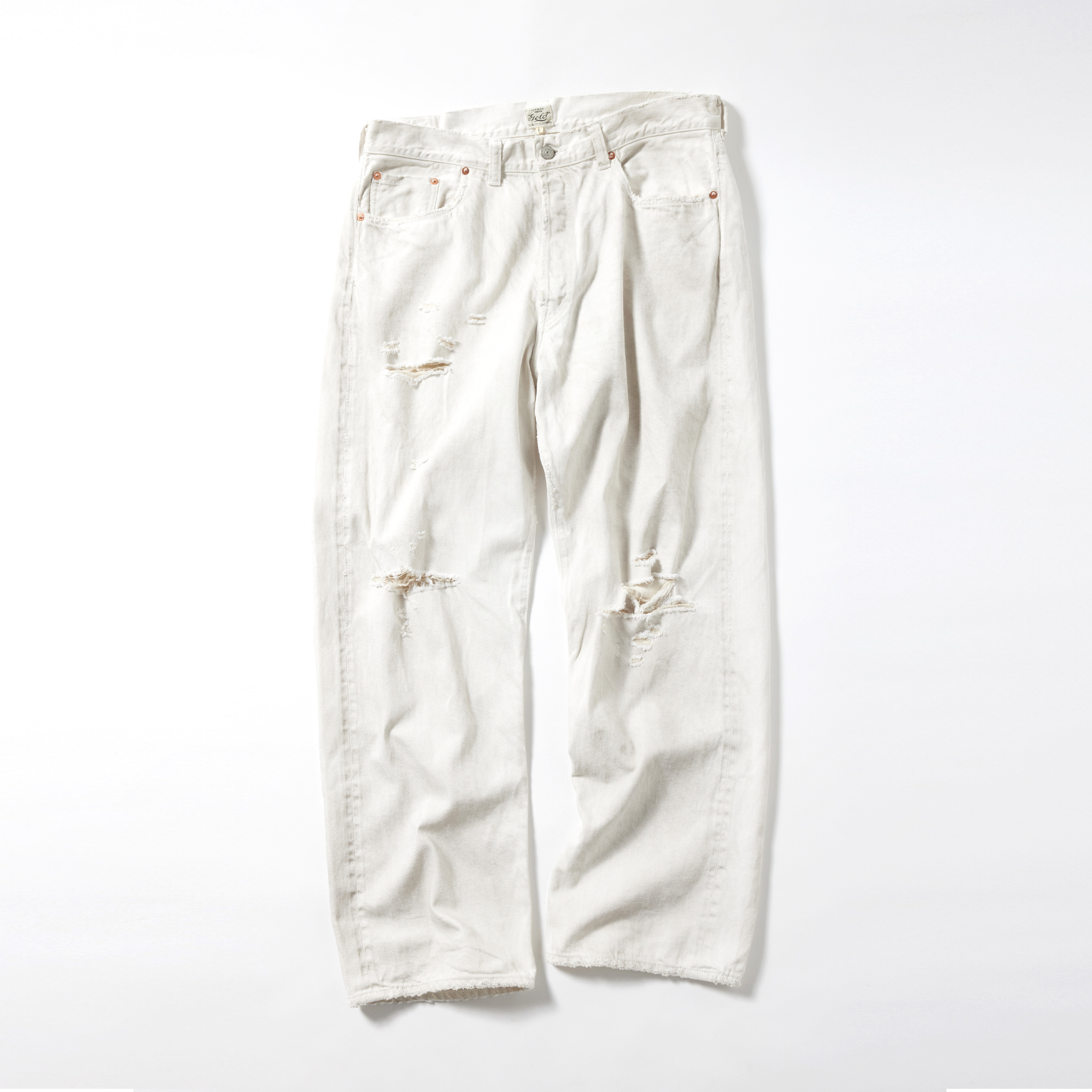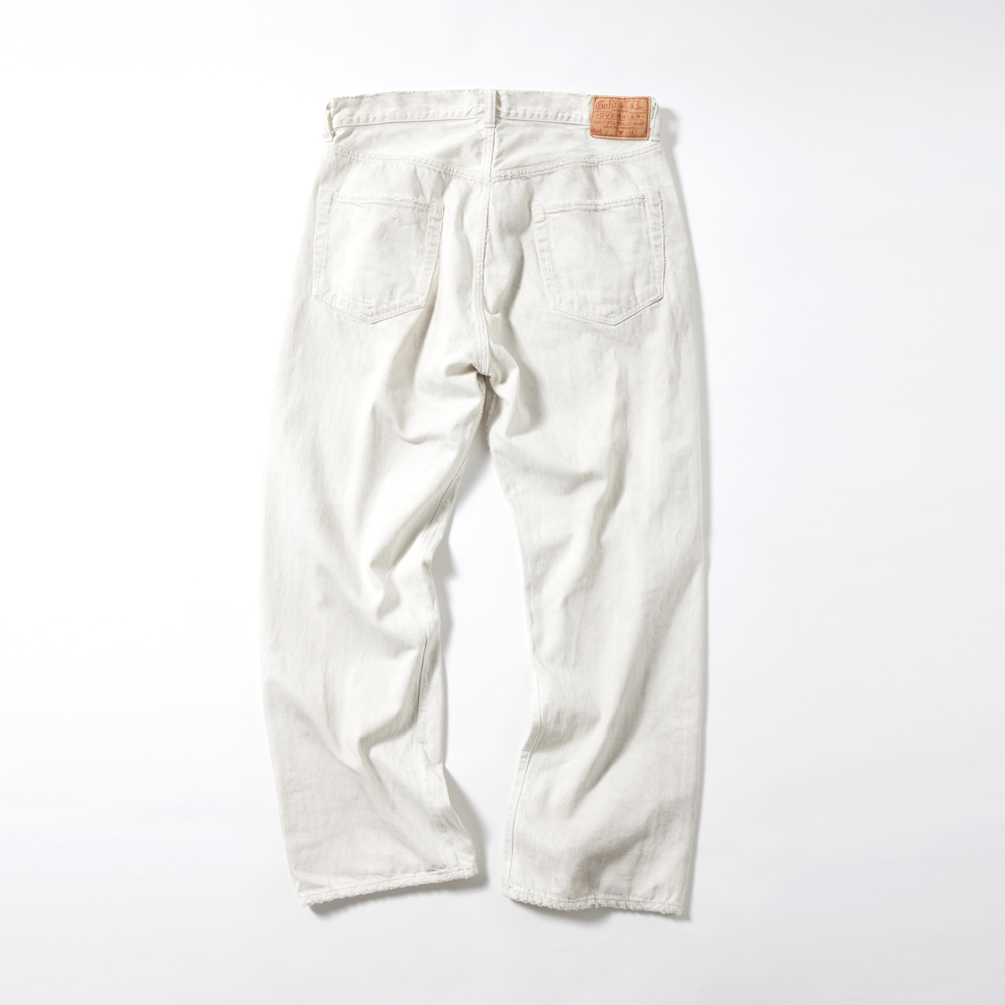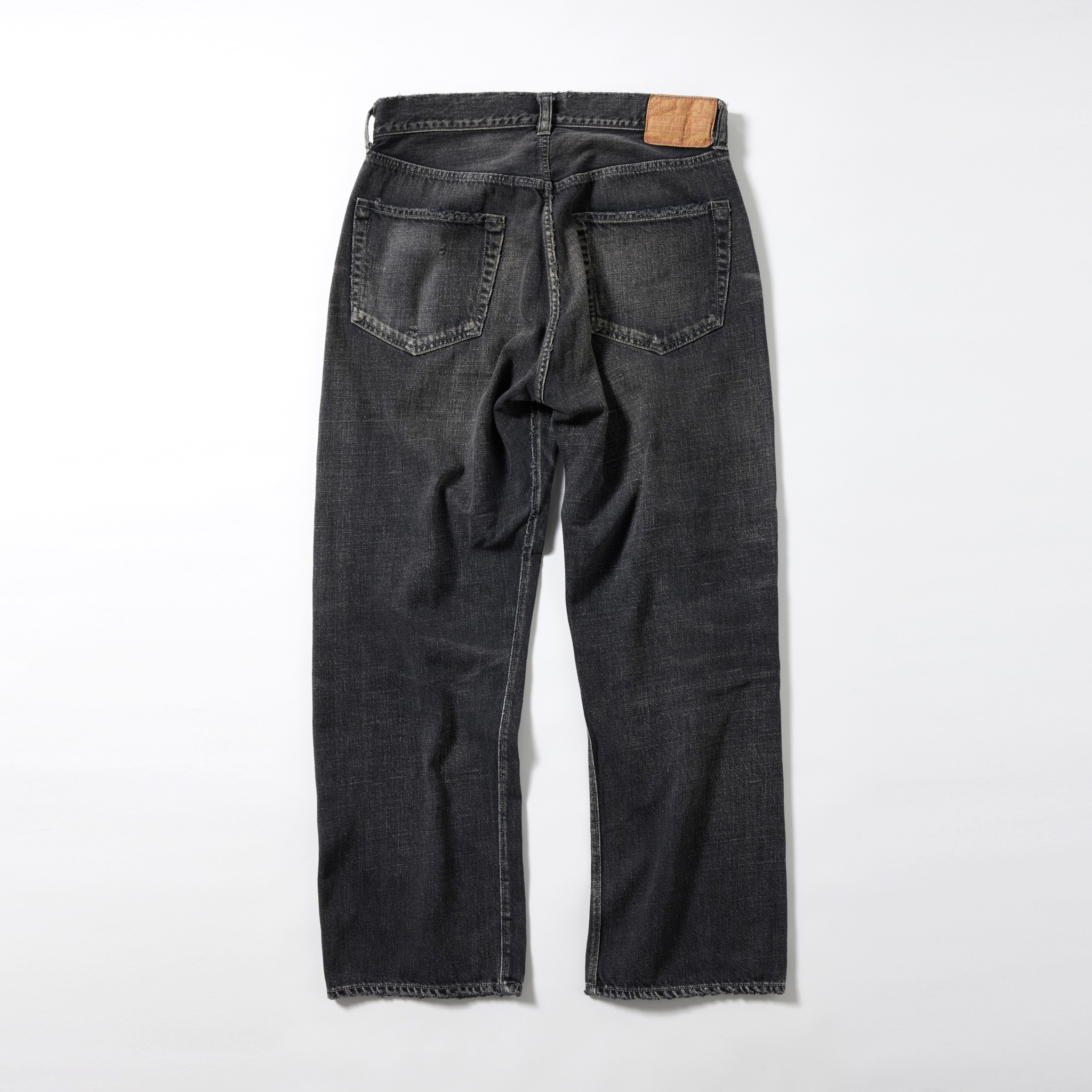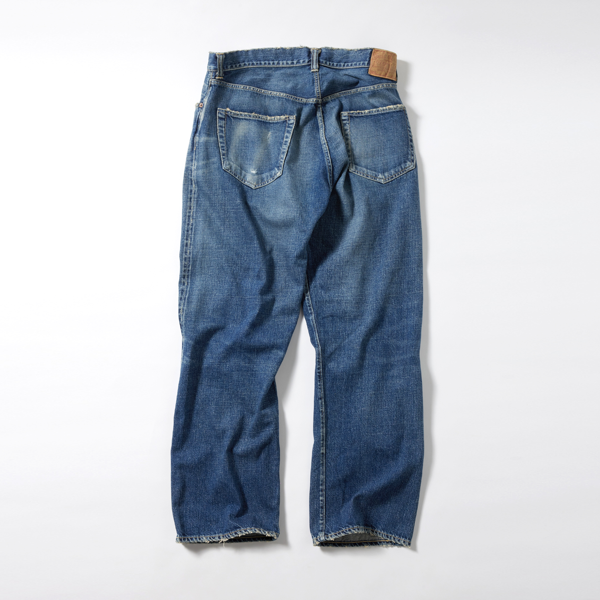 紡績の際、より均一な糸にする為に短いワタや毛羽を削ぎ落とす工程で落ちた超長綿の最高級スビン綿のみを別で収集し、通常のスビン綿と混ぜて作ったオリジナルのデニム生地。 タテ糸7番×ヨコ糸9番の糸をシャトル織機で織り上げた11.5オンスのセルビッジデニムは、落ちワタのムラ感やネップが特徴的で、スビン綿ならではの滑りや肌触りに優れている。 型は5ポケットパンツの完成型と呼ばれる1947年のモデルを踏襲。ヴィンテージをもとに色落ちやダメージ、リペアを施している。コインポケット口やサイドシームのセルビッジ使い、隠しリベット付きのディテールや縫製仕様もヴィンテージ同様。腰周りやワタリを広めに設定したワイドストレートモデル。