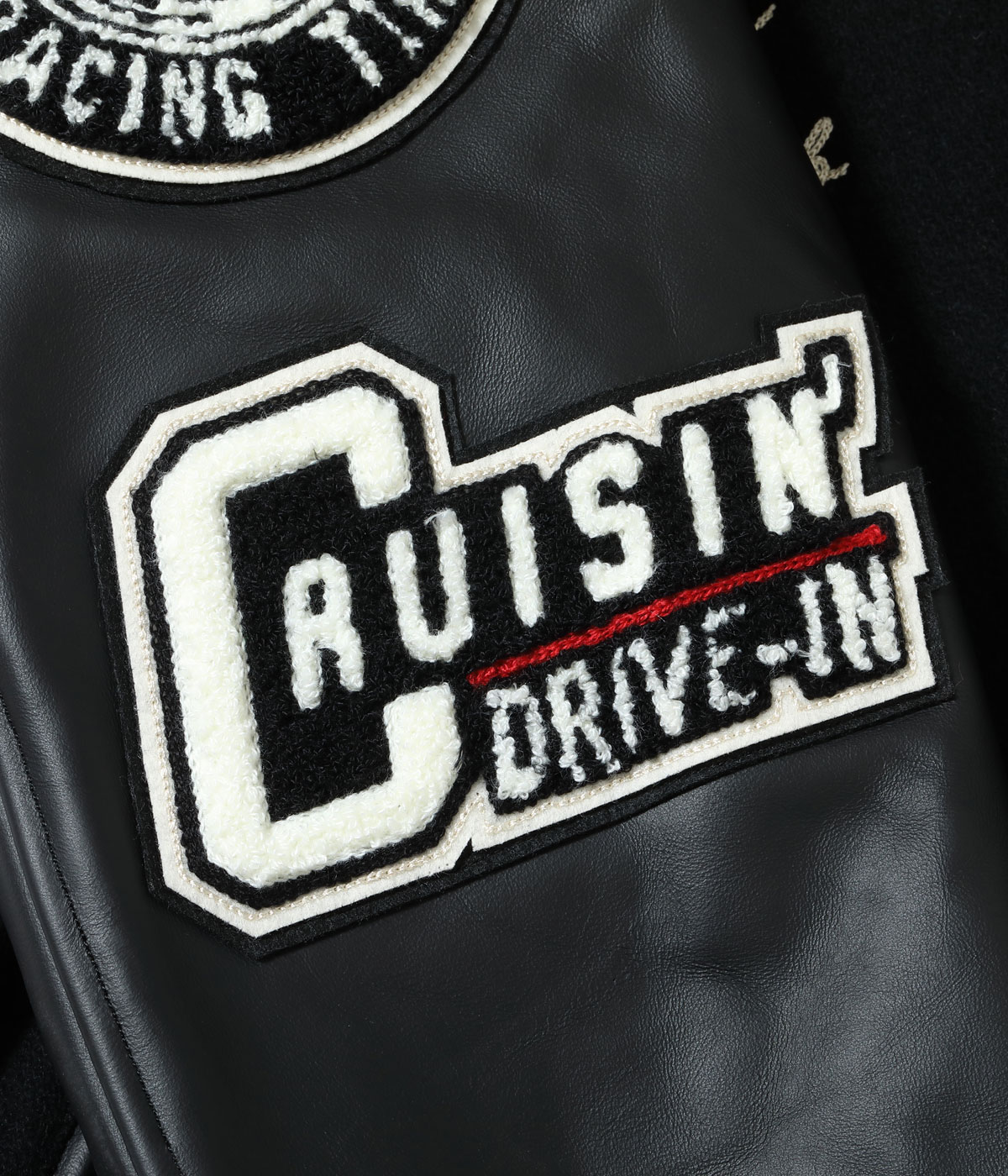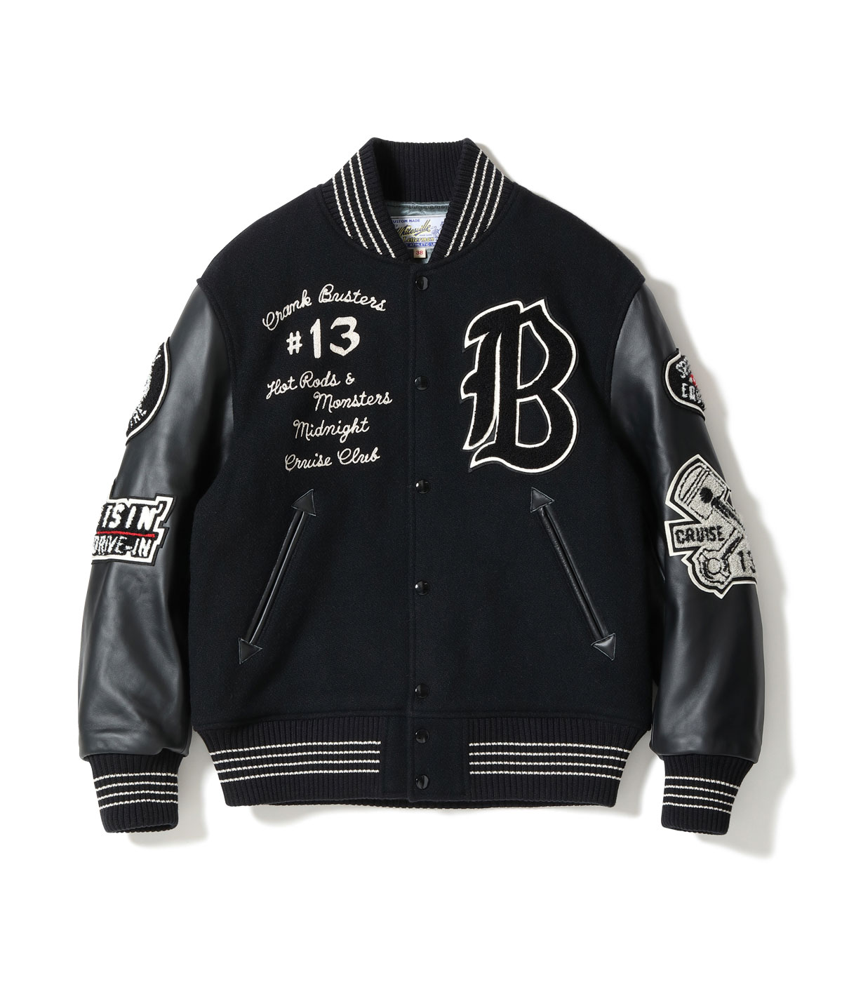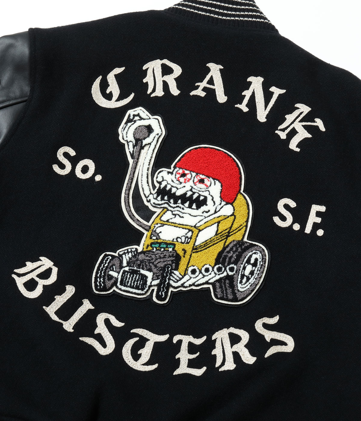 ホットロッドカーのクルーズクラブ、クランクバスターズのチームジャケット。胸にチームの頭文字であるBのシニールとチェーン刺繍でチーム名が施されている。背中に配されたモンスターのシニールはチームの顔となるキャラクターで、強烈なインパクトを放つデザイン。袖にはカーチームらしくピストンやタイヤのシニールが配され、チームとしての団結力が詰まったジャケットに仕上がっている。
