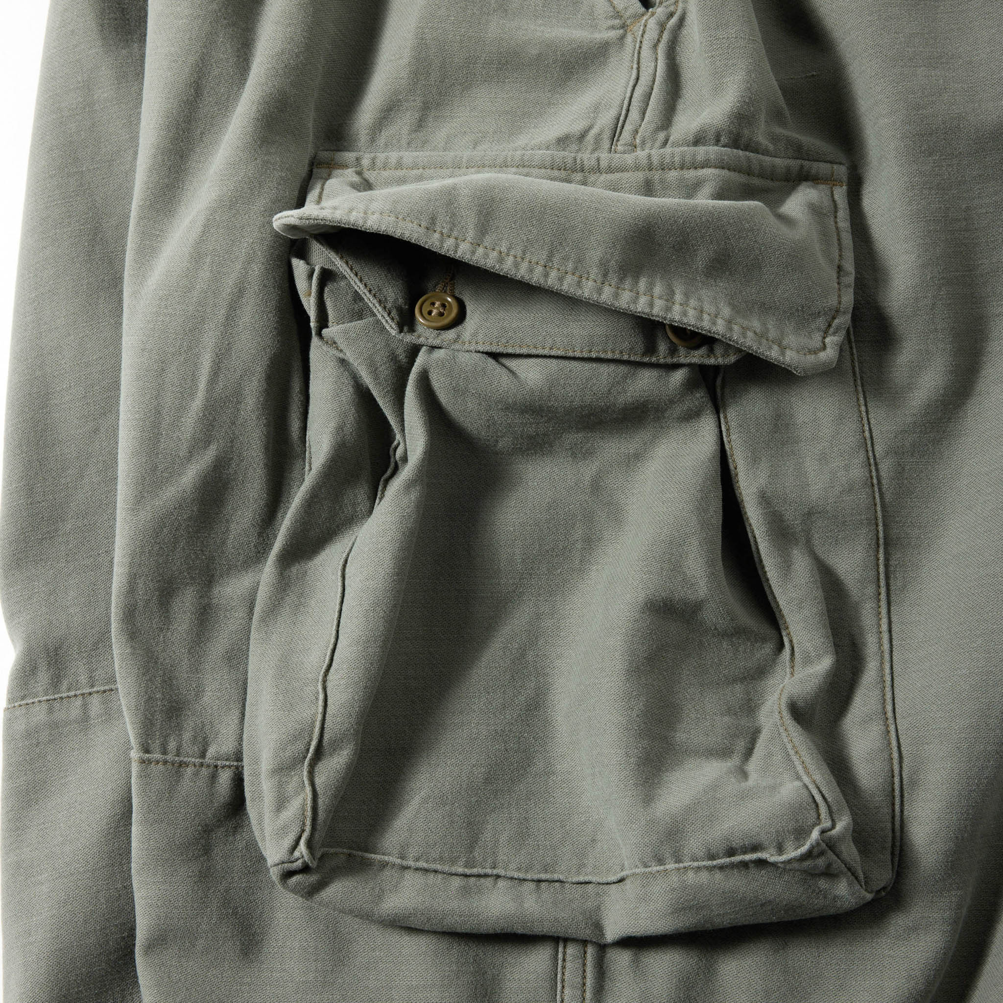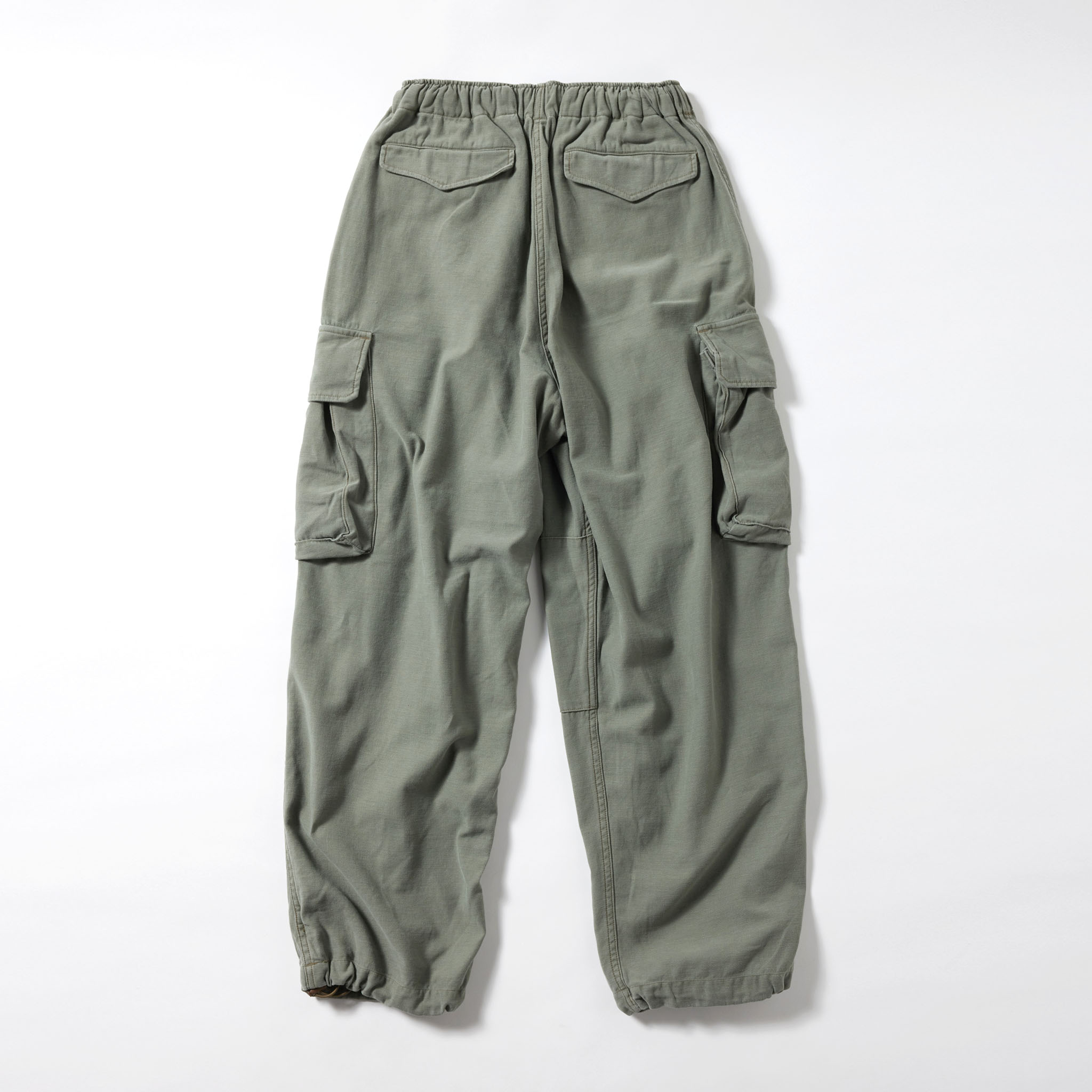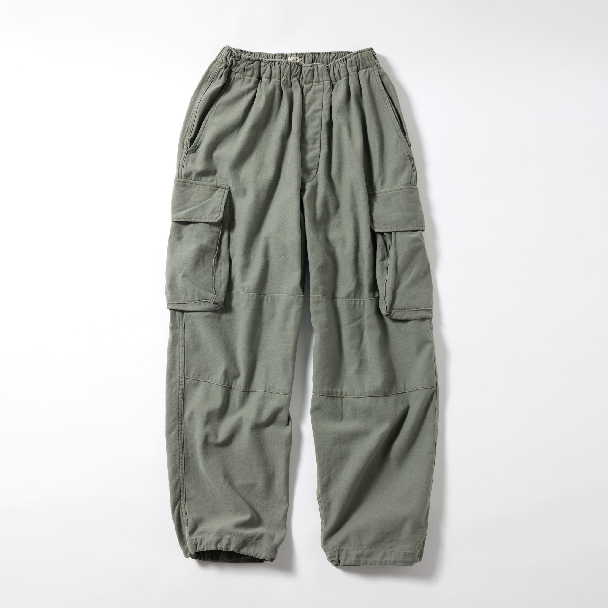 タテ糸16番×ヨコ糸10番のムラ糸で甘く織り上げられたバックサテン生地は、1950年代の朝鮮戦争時に米国陸軍に導入された素材。シャトル織機で織り上げている為、生地の柔らかさと風合いに優れた素材となっている。M-47カーゴパンツをベースにし、着脱のし易いイージーパンツにアレンジしている