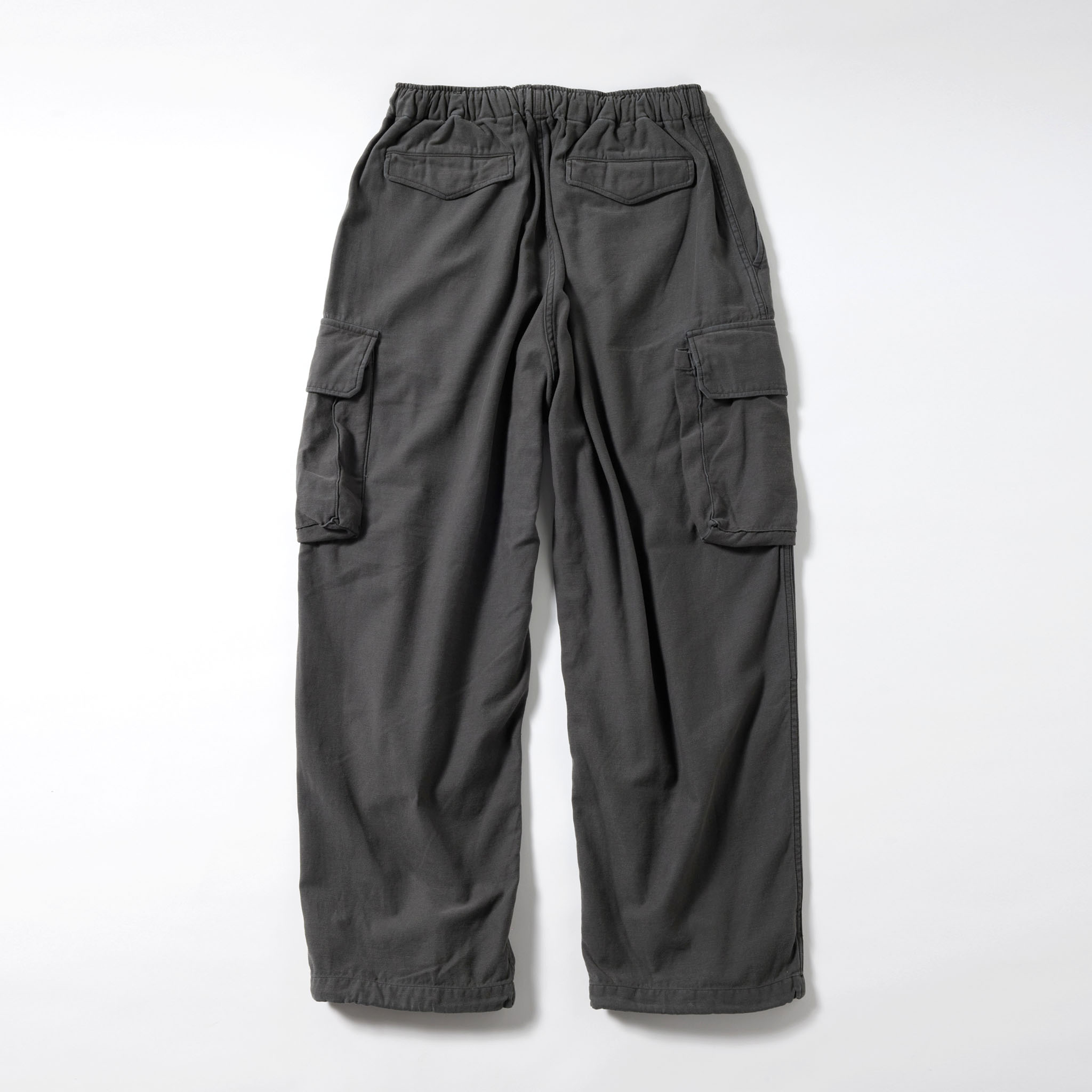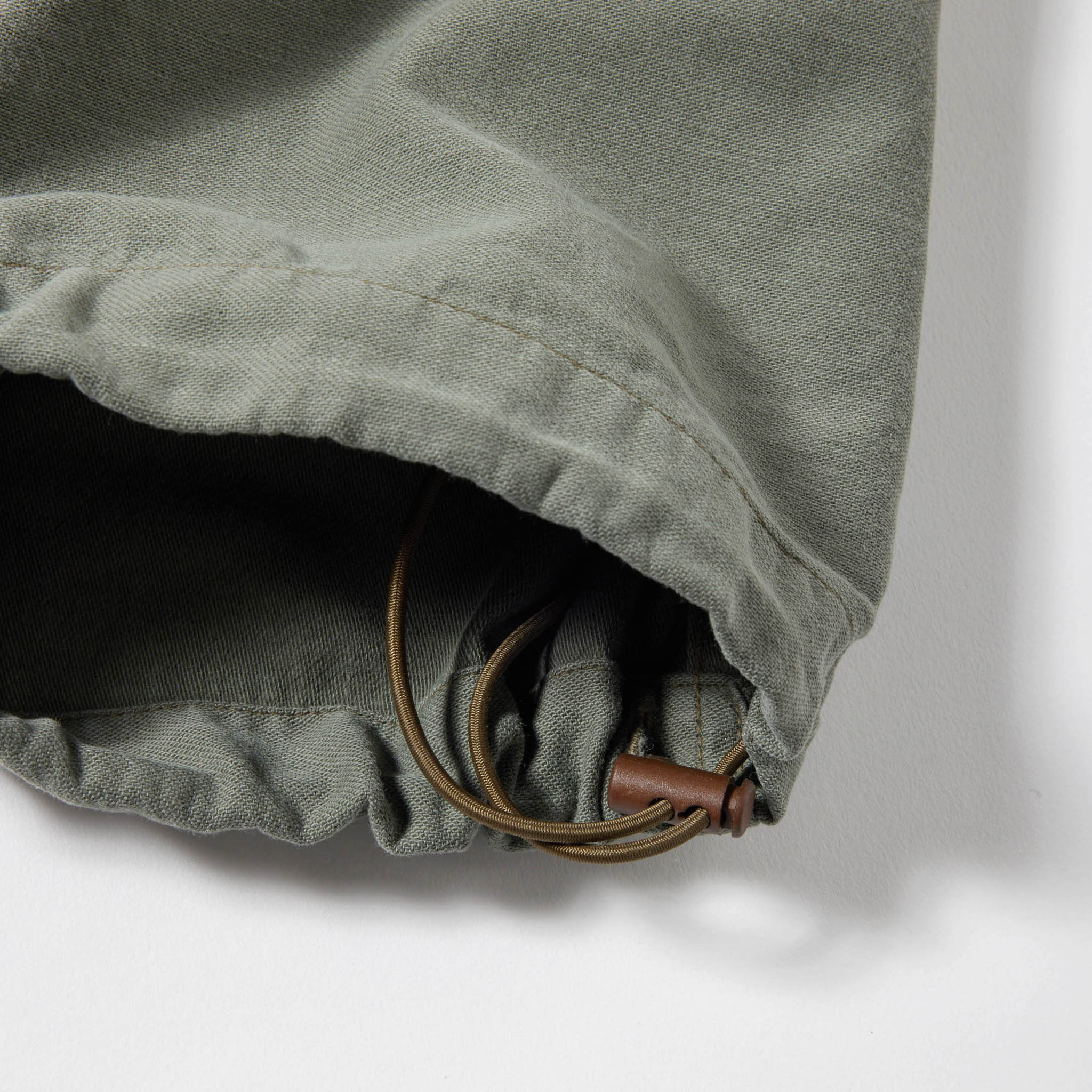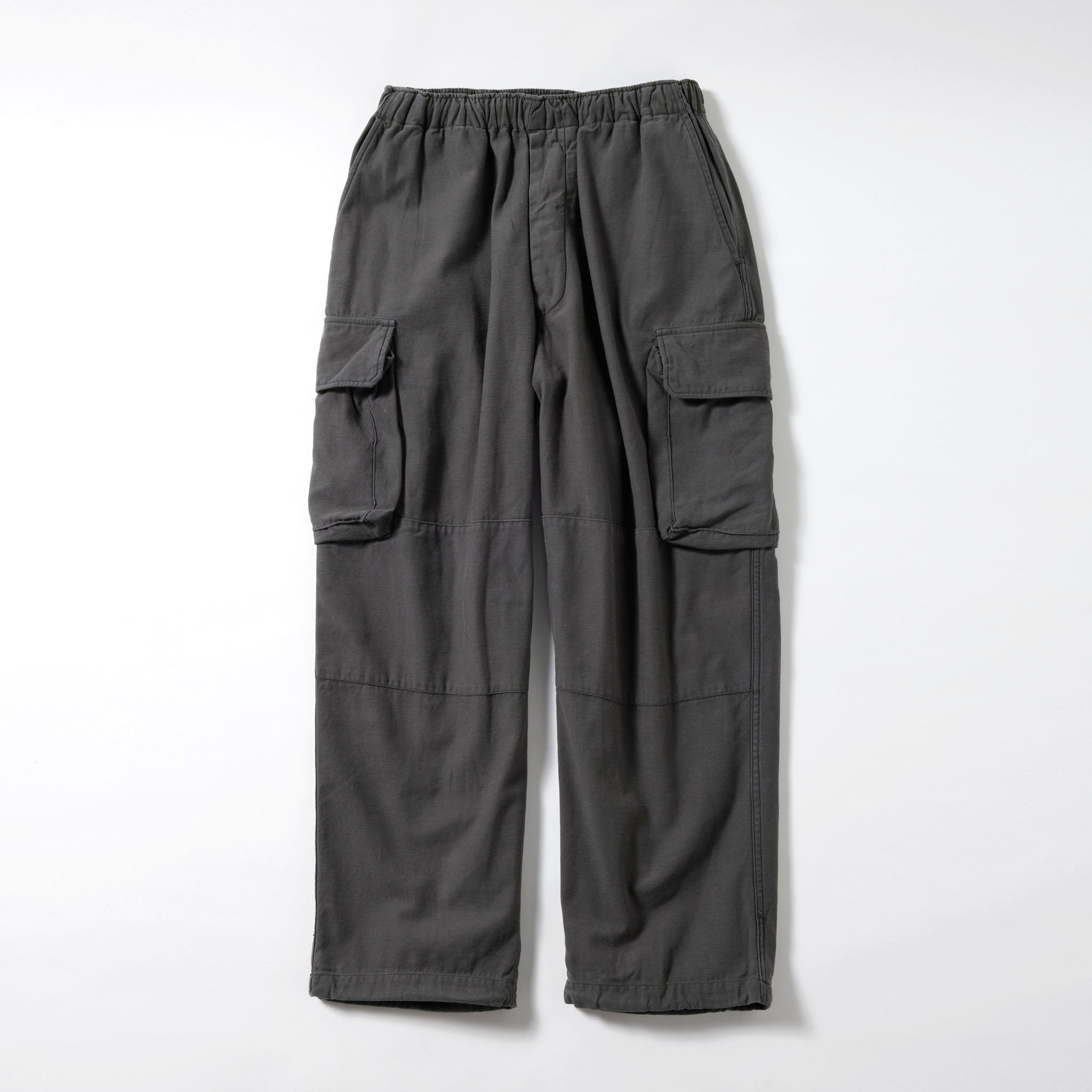 タテ糸16番×ヨコ糸10番のムラ糸で甘く織り上げられたバックサテン生地は、1950年代の朝鮮戦争時に米国陸軍に導入された素材。シャトル織機で織り上げている為、生地の柔らかさと風合いに優れた素材となっている。M-47カーゴパンツをベースにし、着脱のし易いイージーパンツにアレンジしている
