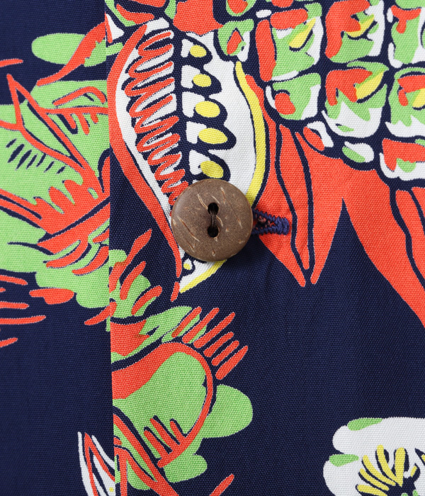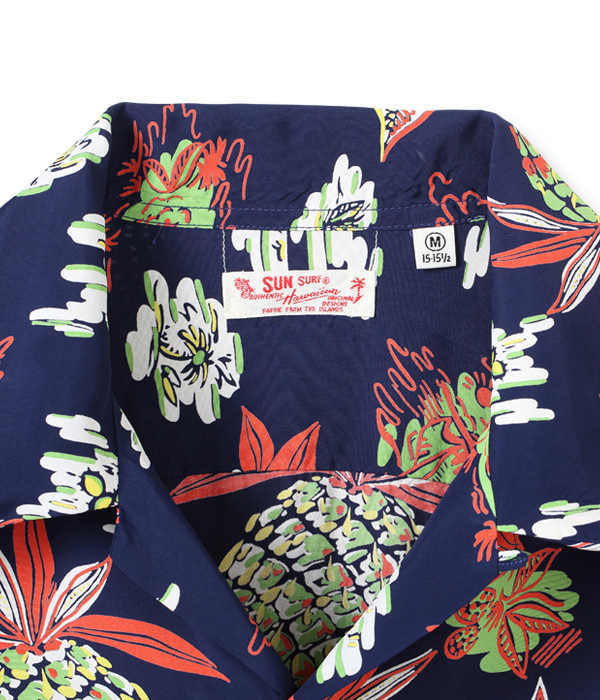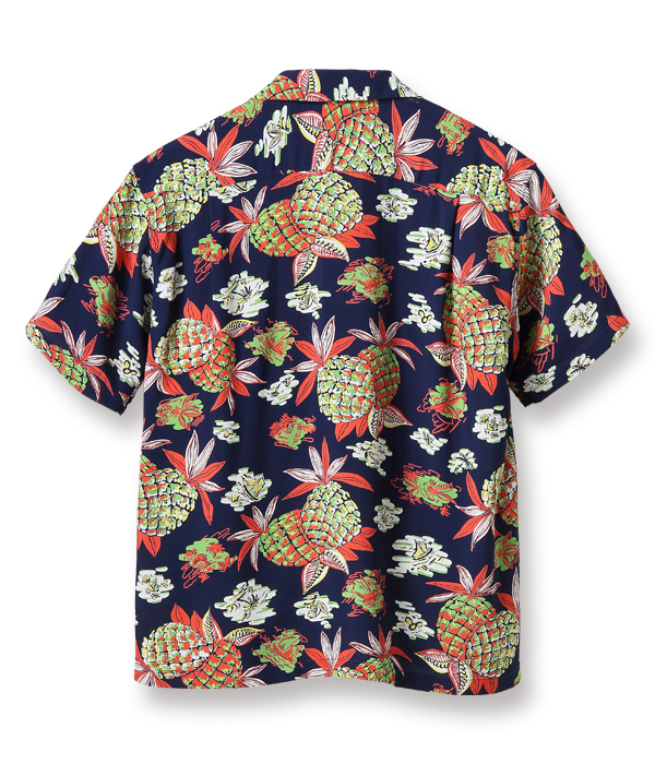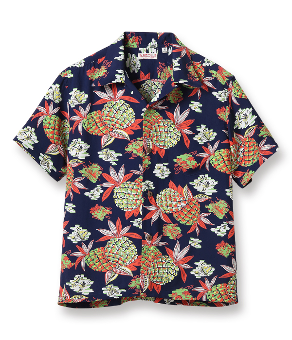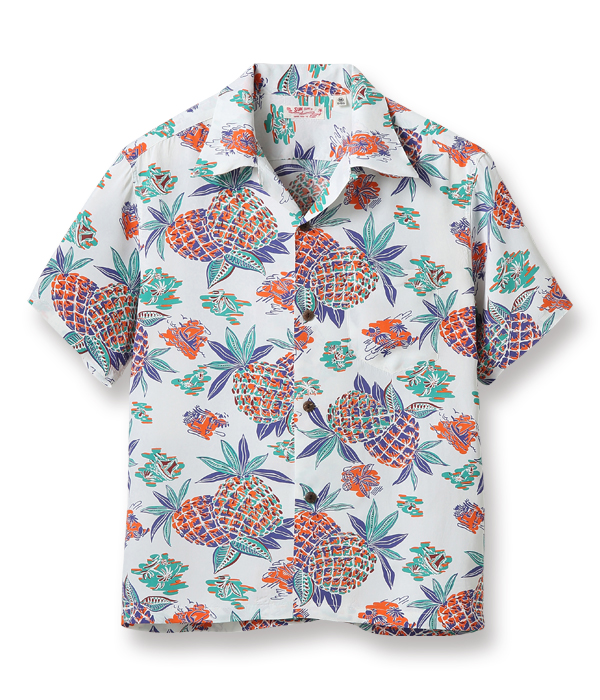 アロハシャツのデザインの中で、最も多く描かれてきたモチーフのひとつが「パイナップル」。ヴィンテージアロハシャツの世界ではパイナップルのデザインだけを蒐集しているコレクターもいるほどであり、見る者の心を捉えて離さない。この作品はハワイの風景をバックに、大きめのパイナップルがオールオーバー・パターン(総柄)で描かれた人気の高いデザイン。