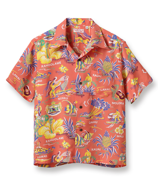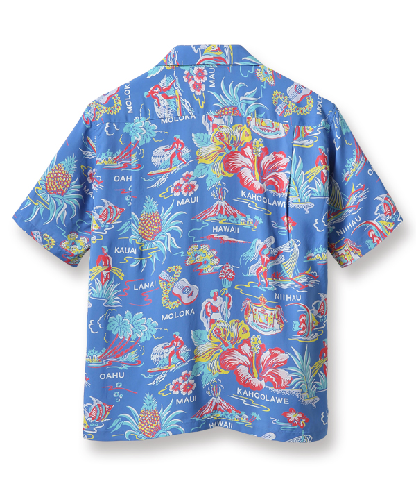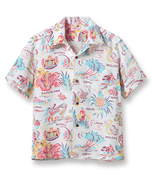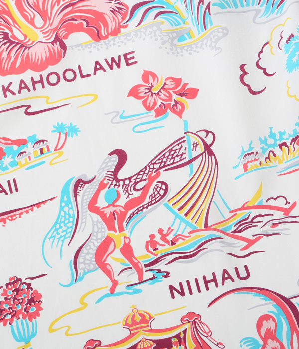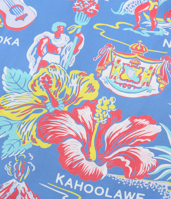 ハイビスカスをメインにカメハメハ大王やパイナップル、さらにはハワイ王家の紋章までもが描かれたコレクタブルな一枚。数あるオールオーバー・パターンの中でも、ハワイの象徴的なモチーフが多く盛り込まれた作品は当時から人気が高く、様々な配色が展開されていた。オリジナルを手がけたのは、日系のマーク・ヤマナカが率いていたハワイ島のブランド、オコレハオ。