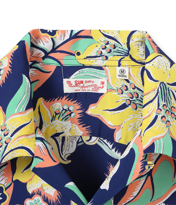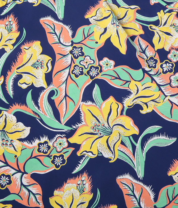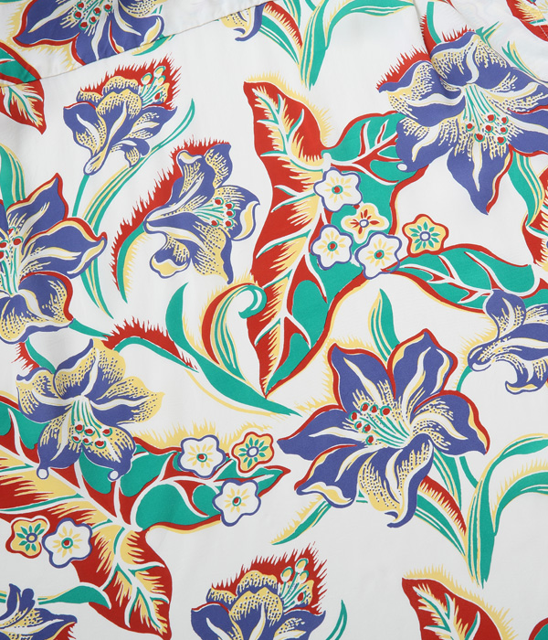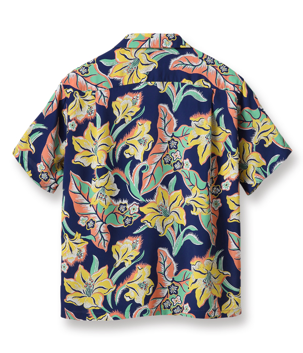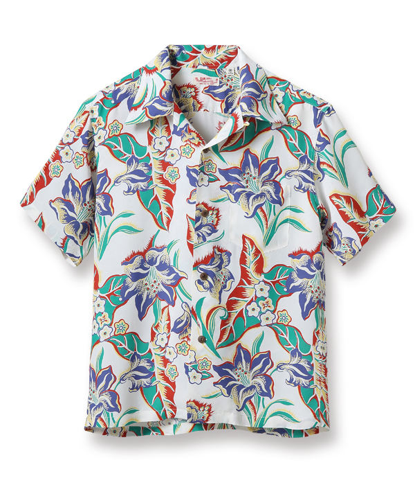 ハワイの老舗百貨店、リバティハウスが 1950年代後期に手がけた一枚。同社はアロハシャツのデザインにいち早く流行を取り入れ、地元の人々のみならず、アメリカ本土の観光客からも人気を博していた。ハワイには日系人の手によっていくつもの品種のユリが根付いた歴史があり、この作品のモチーフとなっているのもスターゲイザー・リリーと呼ばれるユリの花。