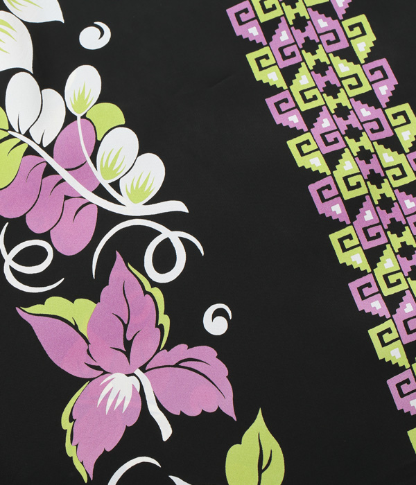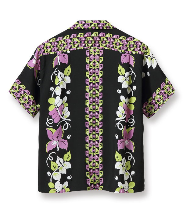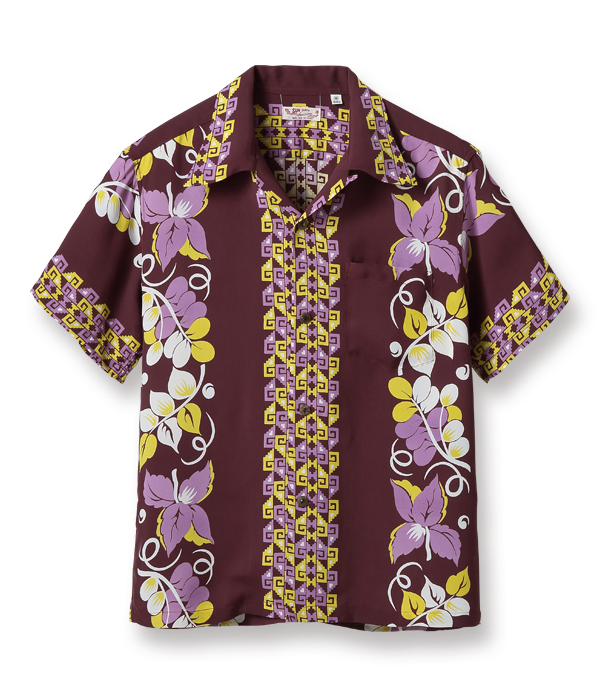 幾何学模様のボーダーと抽象的な花柄のボーダーが絶妙なバランスで配されたデザイン。ヴィンテージアロハシャツにおいて総柄と並び多く見られるボーダー柄には、構図や配色に時代の流れが取り入れられたものも存在する。特に1950年代の作品は、ハワイだけでなくアメリカ本土での販売も視野に入れ洗練されたデザインが多く、当時のアロハシャツの人気がうかがえる。