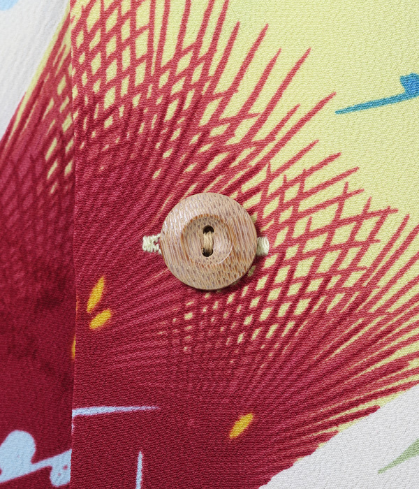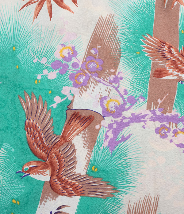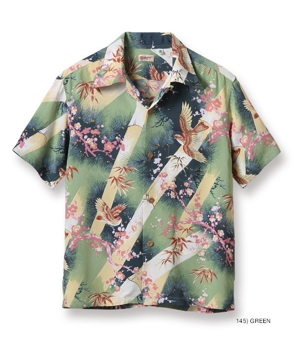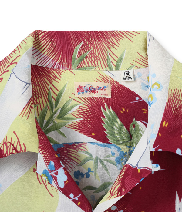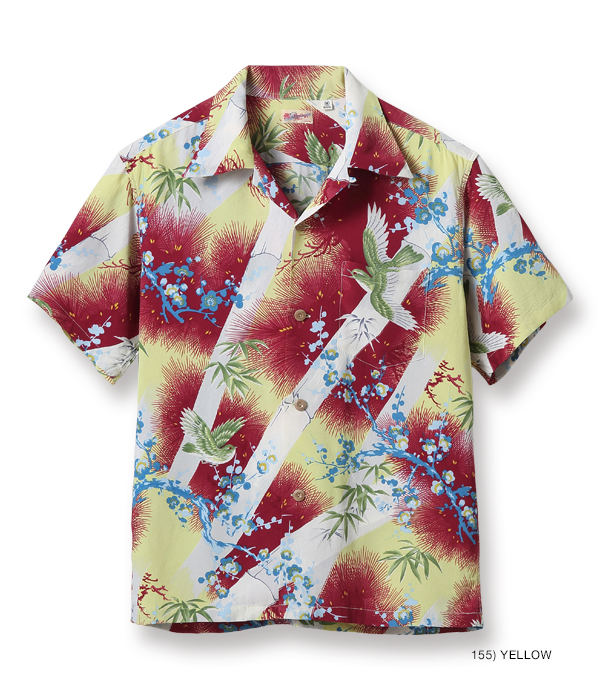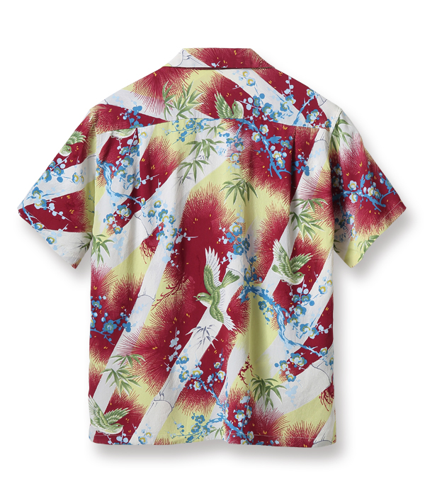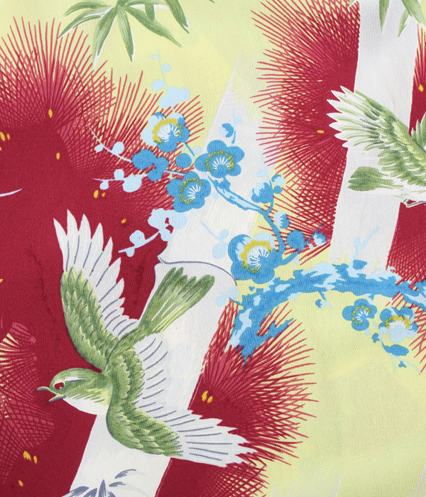 スズメたちが竹林を飛び交う様を、独特な色使いと大胆な構図で描いた作品。オリジナルを手がけたのはアロハシャツの歴史を語る上で欠かせない、1913年に創業したイースト・インディア・ストアのブランド、ワットムルス。同ブランドの絵柄に対するこだわりは強く、オリジナルデザインの開発のため、日本のプリント工場へ捺染技術を学びに来るほどであった。