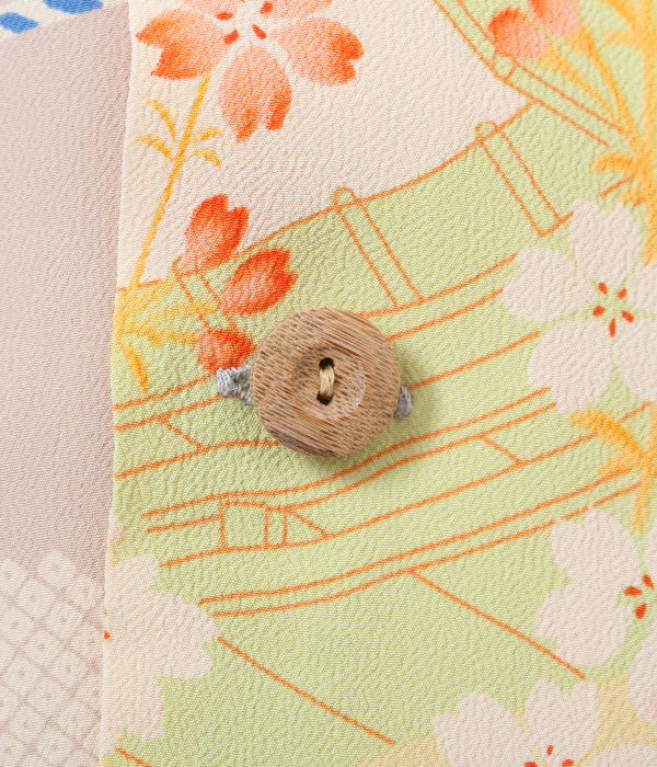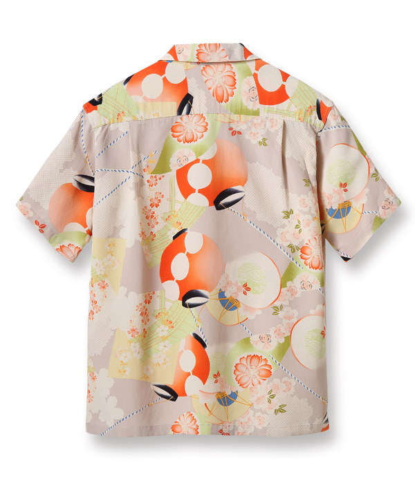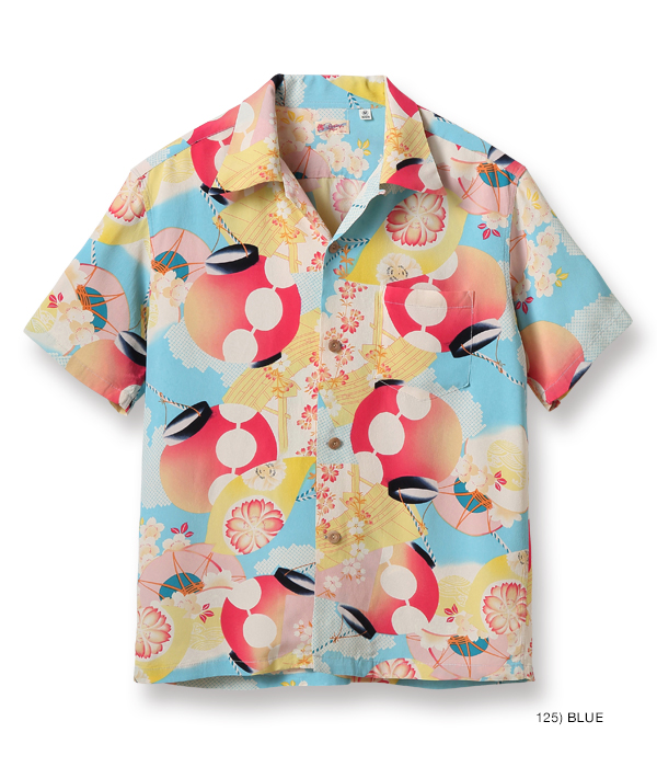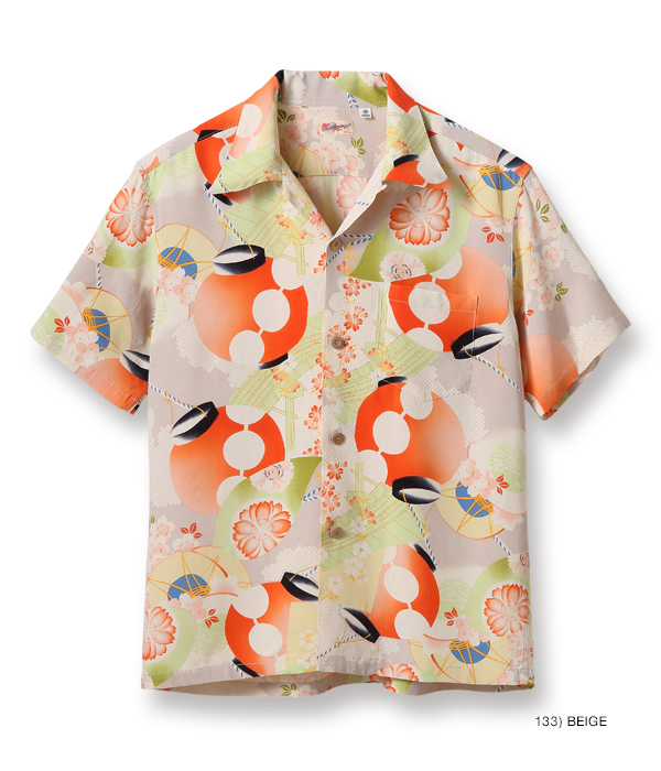 1940年代の中頃、京都にアロハシャツの生地をプリントする工場、アロハ貿易が設立。またハワイでは商社「ヴィクトリー・インポート」が立ち上げられ、プリント生地を日本からハワイへ輸出するルートが確立した。この作品も同ブランドが日本でプリントを手がけ、ハワイで販売していたもので、祭りの夜に連なって飾られる提灯がメインモチーフとなっている。