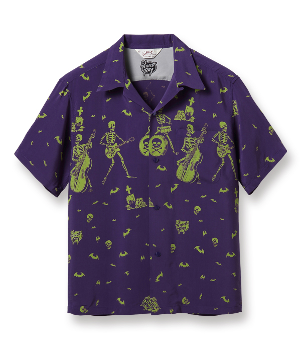 夜な夜な墓場でロックンロールを演奏する骸骨のバンド“THE SKELETONES”がモチーフ。クラシカルなギター、ダブルベース、スタンディングドラムといったストレイ・キャッツに代表されるネオロカビリースタイルで、自身もミュージシャンであるヴィンス・レイならではの一着。オーソドックスなブラックに加え、ポップで奇抜な配色のピンク×サックス、1980~90年代のサイコビリーカルチャーを意識したパープル×ライトグリーンと配色にもこだわりをみせる。