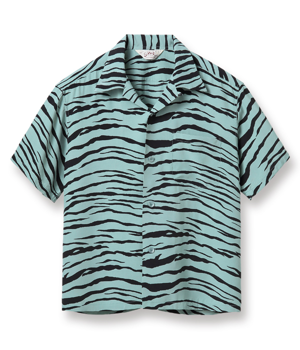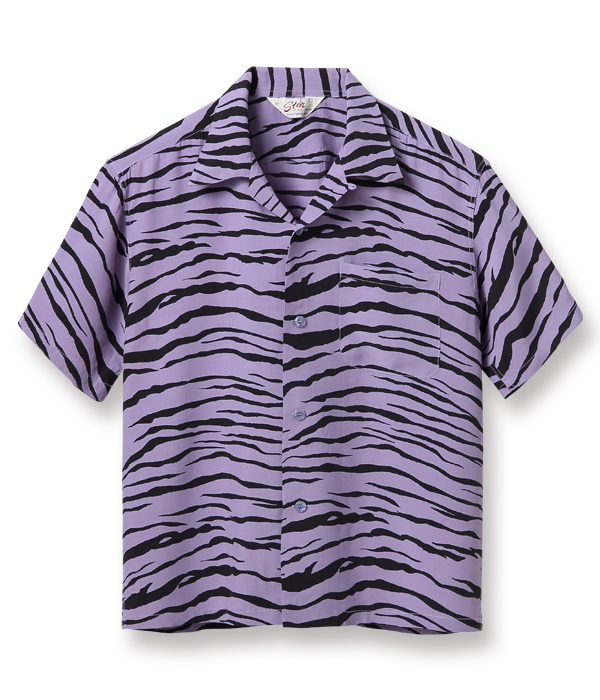 フィフティーズカルチャーにおいて人気のアニマル柄はヴィンテージでも貴重であり、市場では高額で取引されているアイテムのひとつ。本作は一見、ゼブラ柄にもみえるが、虎斑(とらふ)をテキスタイルデザインへと落とし込んだタイガー柄。アニマル柄のヴィンテージの中でも特に珍しい逸品である。配色はイエロー、フィフティーズならではのミントグリーン、妖艶な雰囲気を漂わせるパープルの3色展開。スターオブハリウッドらしい“BAD”なシャツに仕上がった。