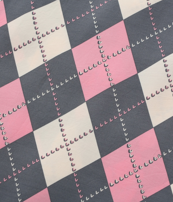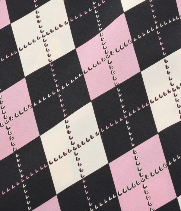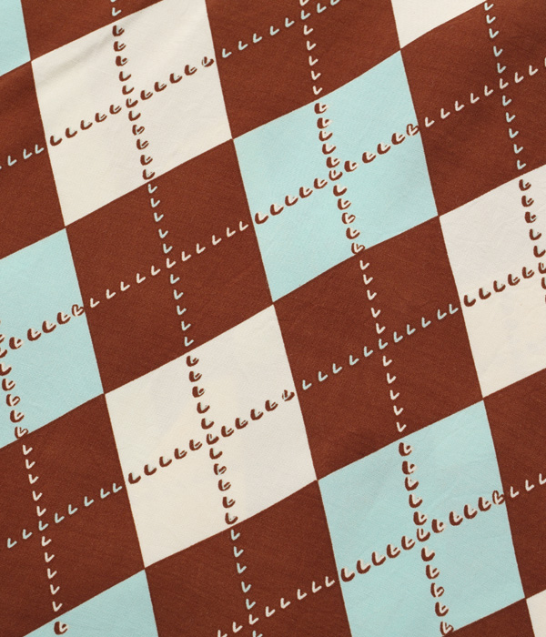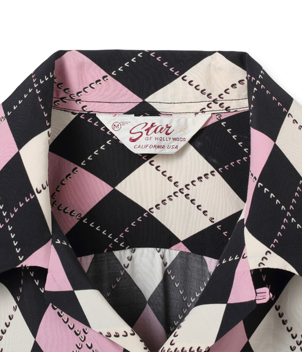 1950年代を象徴するアーガイル柄が全面に敷き詰められたデザイン。アメリカンヴィンテージクロージングの専門書に幾度となく掲載されてきた作品で、知名度も高い。実際のヴィンテージには厚手のレーヨンツイル生地が使われているが、敢えて平織りの高密度レーヨン生地を使い、発色良く軽やかに仕上げた。配色もフィフティーズの雰囲気満載で、コントラストが際立つブラック×ライトパープル、ブラウン×ミントグリーン、グレー×ピンクの3色展開。