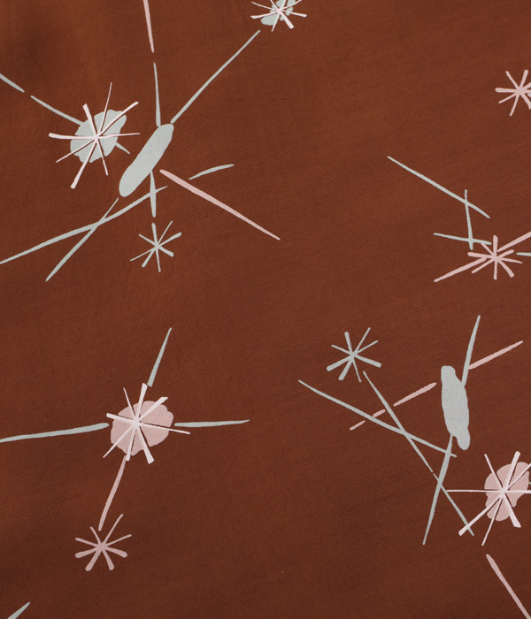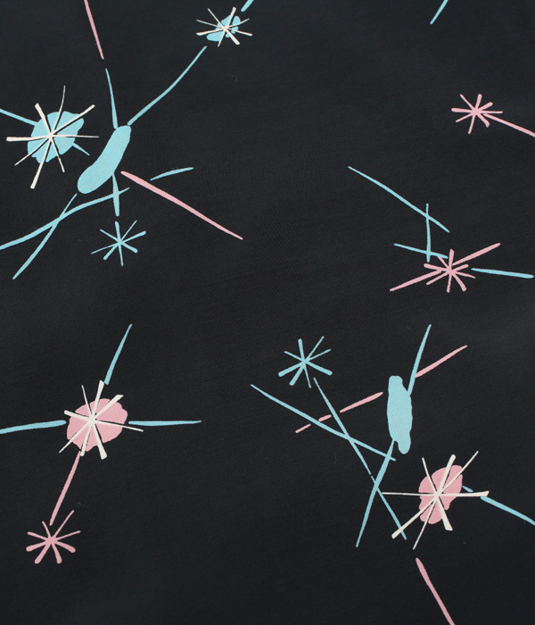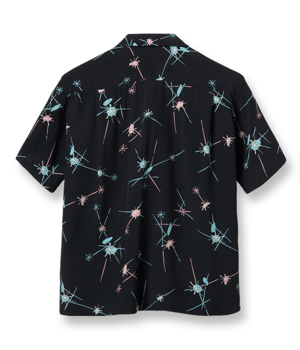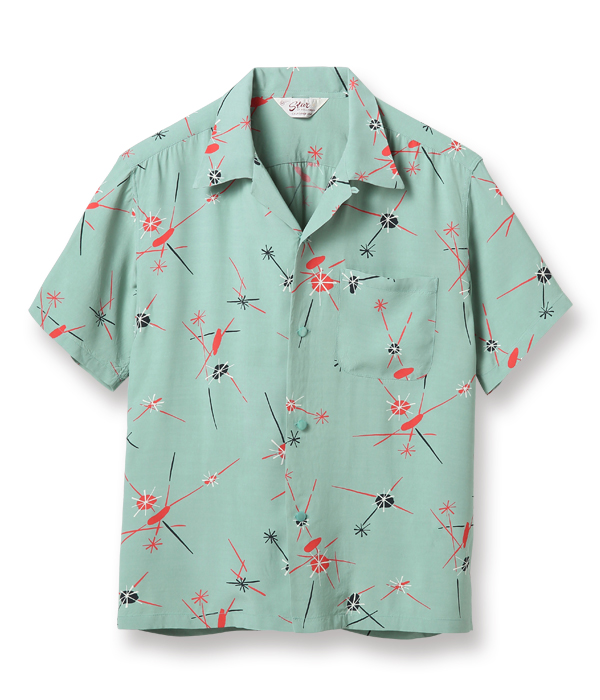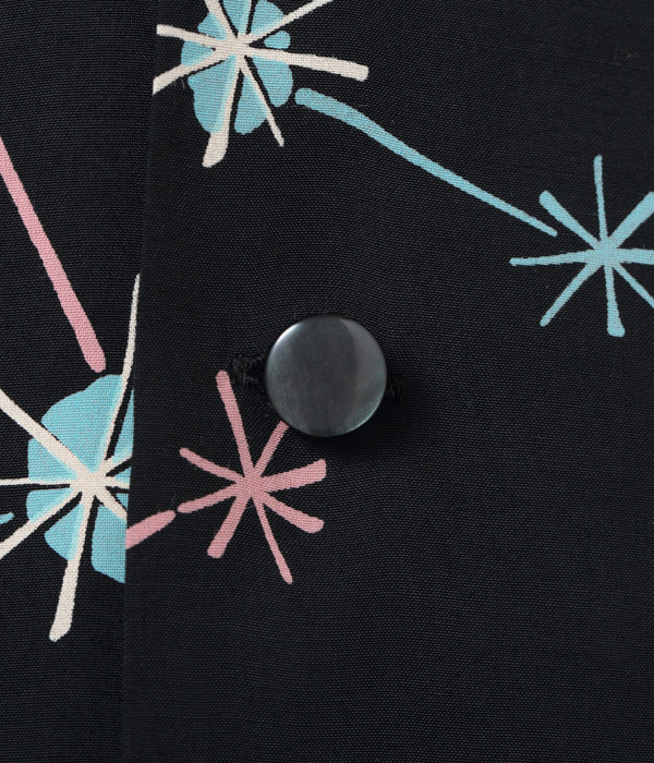 弾ける光の玉と走る閃光のようなモチーフで構成された1950年代中期の作品。このような通称「アトミック柄」はフィフティーズ特有のデザインで、ヴィンテージ市場でも価値が高い。また、モチーフの色と地色の強いコントラストから生み出されるテキスタイルの魅力も1950年代のプリントシャツならではの特徴。ショートスリーブだけなくロングスリーブのモデルも展開する。