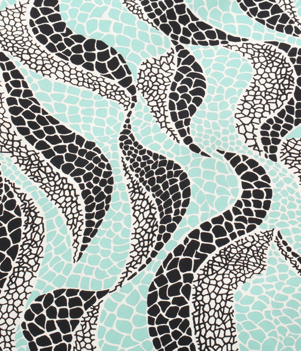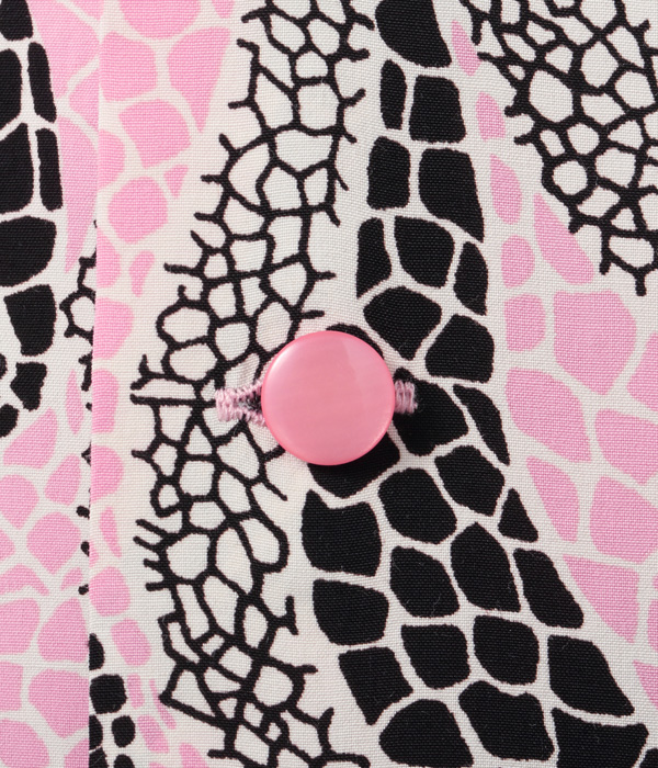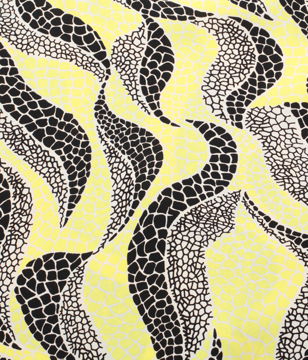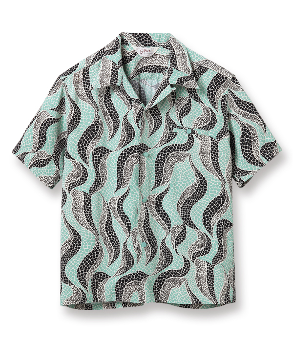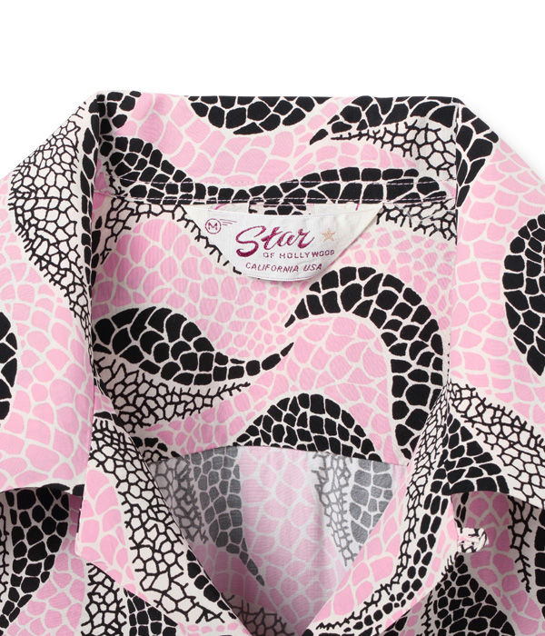 軟体動物を想わせる曲線のモチーフと、爬虫類のウロコのような模様を掛け合わせた不思議な魅力を持つ作品。使用している色数は少ないものの、柄の密度が一定ではないことで全体にグラデーションがかかっているように見える。1950年代のアメリカではアート性の高いシャツが数多く作られたが、それらの中でも特に奇抜でインパクトの強い、唯一無二のデザインと言えるだろう。このような一着こそ、スターオブハリウッドの名で復刻するに相応しい。