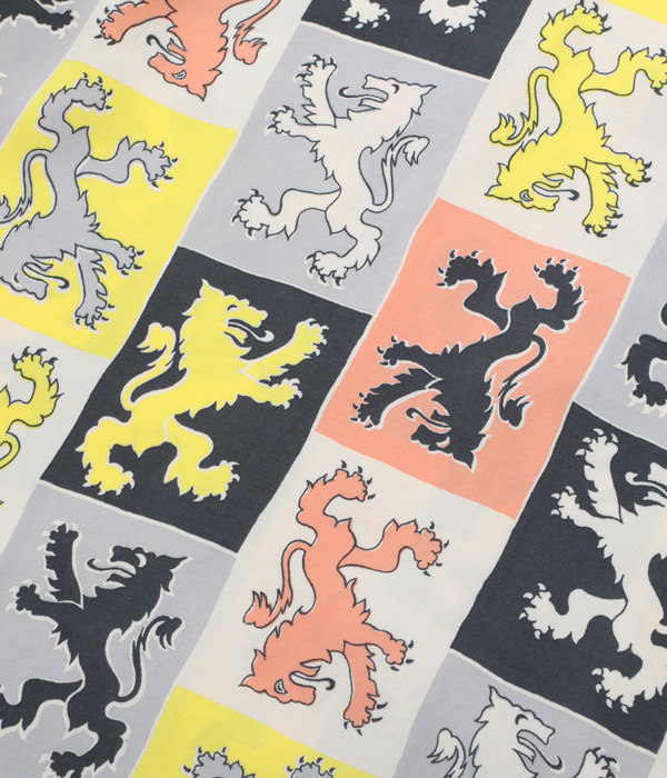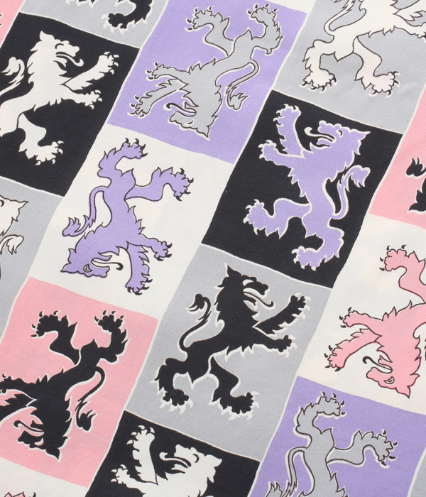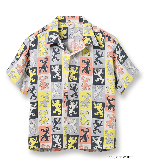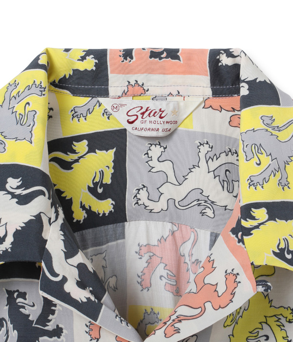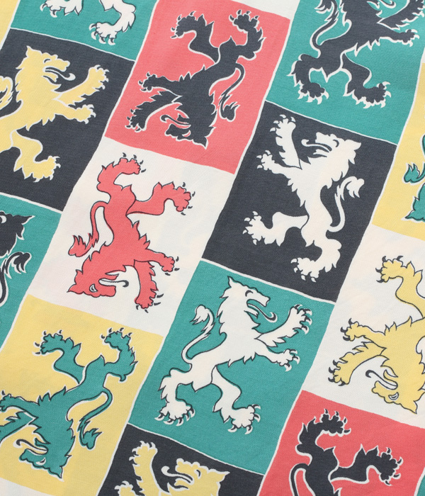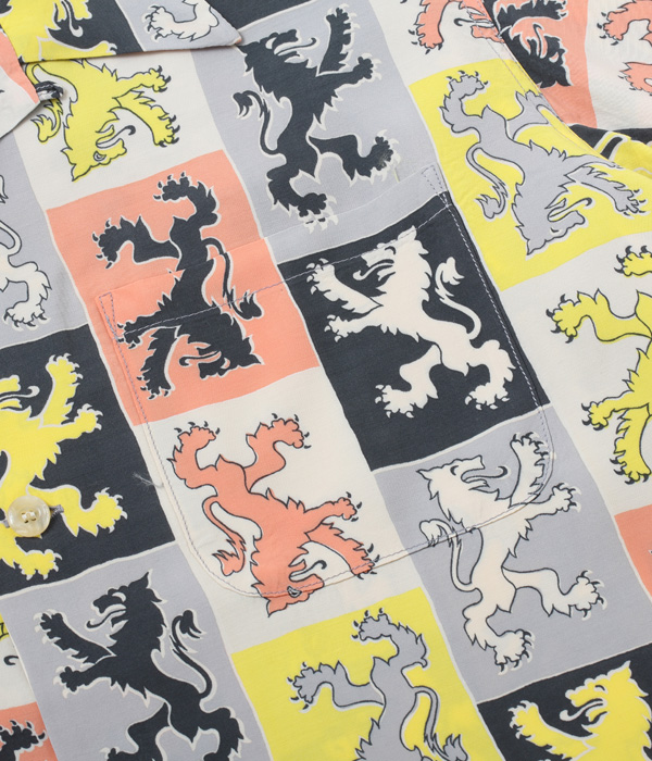 ライオンを真横からのアングルで描いた紋章風のデザインをシャツ全体に敷き詰めた1950年代中期の作品。百獣の王であるライオンは権力の象徴でもあり、このような紋章のデザインに古くから使われてきた。ホワイトの地に対して4色の版を使い、ヴィンテージをもとに再現した淡い色合いで配色が組まれているが、どの配色もブラックの版が全体を引き締めている。フィフティーズヴィンテージの中でも滅多にお目にかかれない、レアでスペシャルな一着。