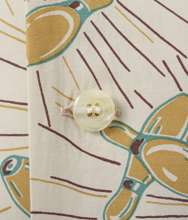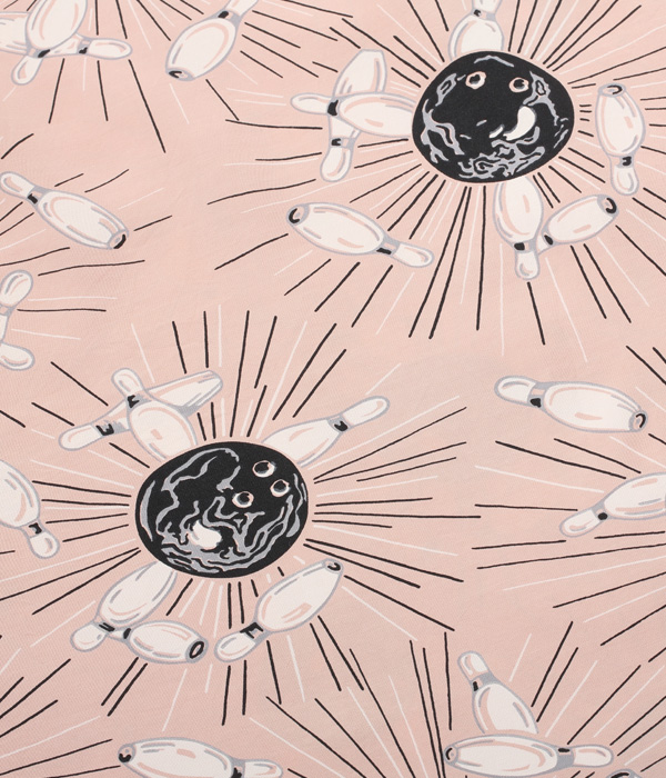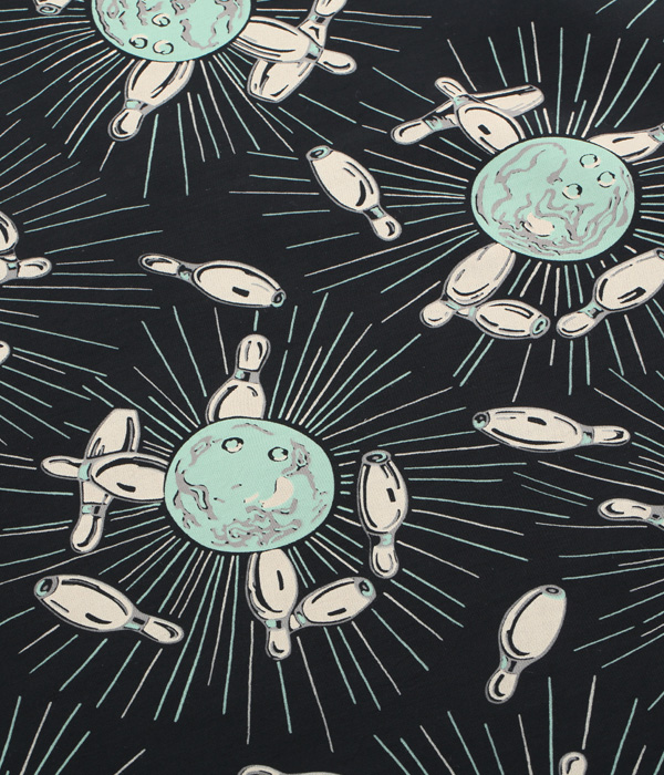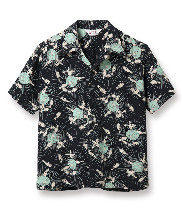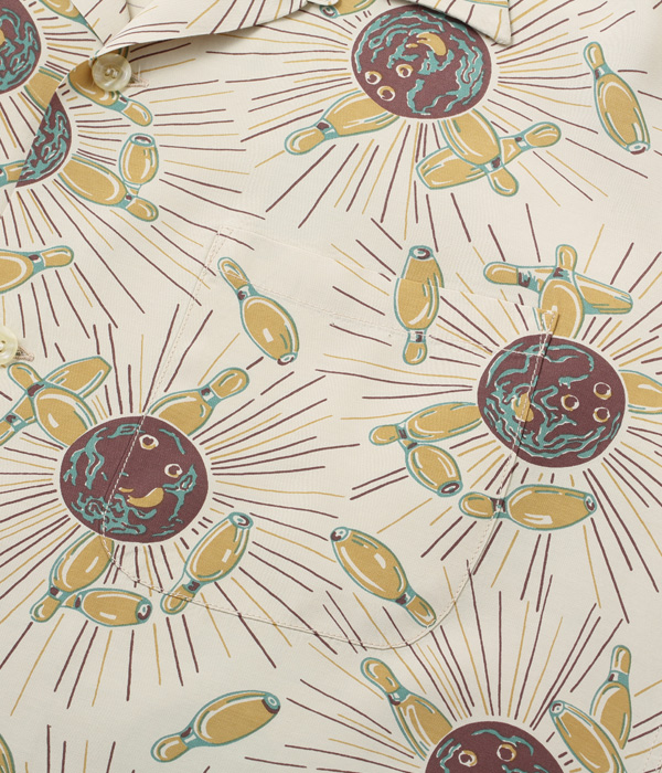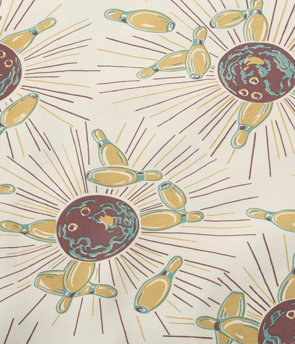 1950年代のアメリカではボウリングブームが巻き起こり、競技用のユニフォームやオリジナルのチームウェアとして数多くのボウリングシャツが作られた。それらは現在、ヴィンテージとなって古着屋に並んでいるが、刺繍ではなくこのようにボウリングモチーフの絵柄がプリントされたものは希少で、コレクター垂涎の逸品。また、この作品は1950年代初期に作られたものであるため、50年代中期~後期のヴィンテージと比較すると落ち着いた配色となっているのも特徴。