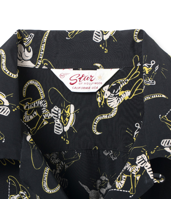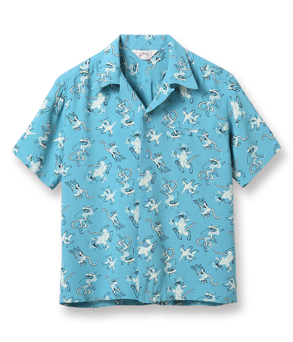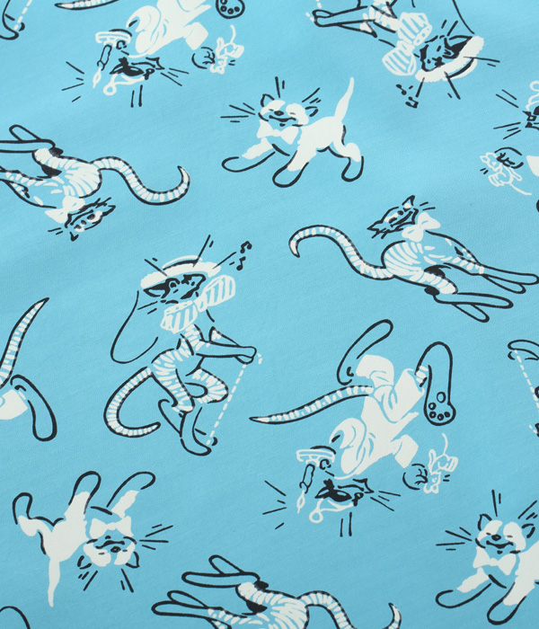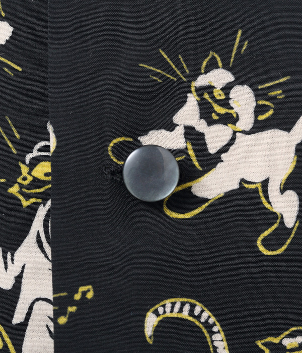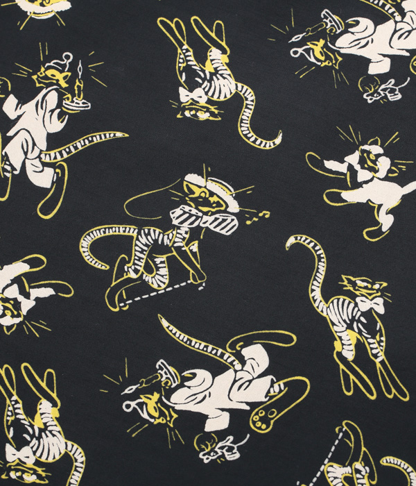キュートな猫をモチーフとした1950年代中期の作品。ステッキを持ったダンサーの猫や、ナイトキャップをかぶりロウソクとネズミを持った猫など、見た者を笑顔にさせる4種類の可愛らしいキャラクターで構成されている。フィフティーズヴィンテージにおいて、猫柄は女性のスカートやワンピースなどに見受けられるが、メンズのシャツでは非常に珍しいデザイン。実物をもとにプリントの版を起こし、抜染プリントならではのハレーションも忠実に再現した。