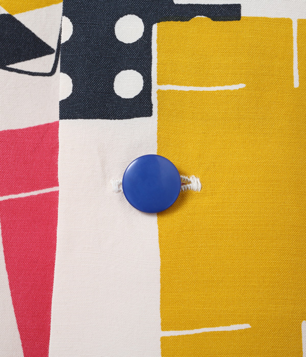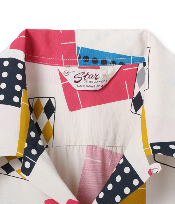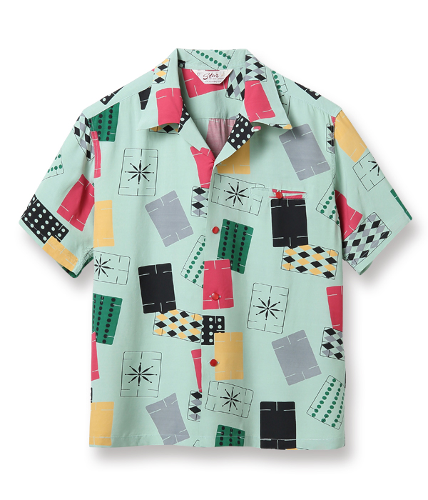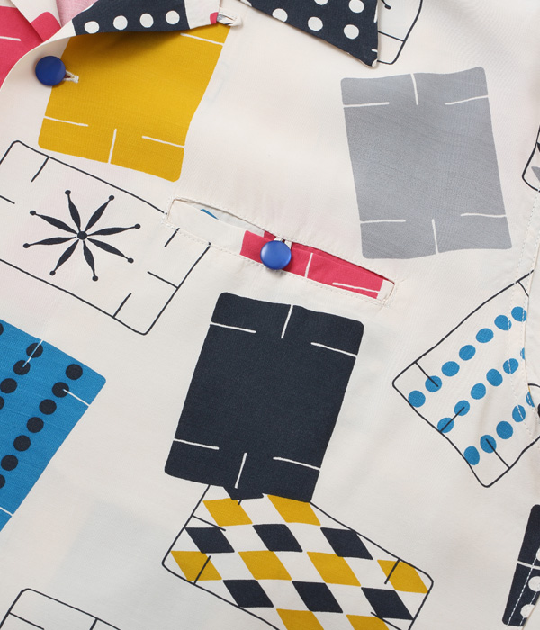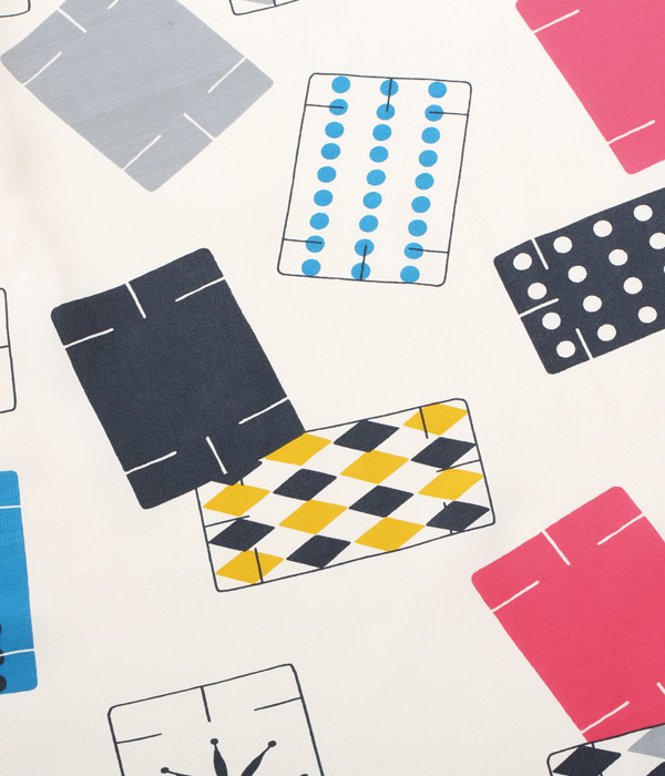 カードゲームのカードやドミノなどのモチーフをデフォルメし、総柄にプリントした作品。1950年代の好景気に沸くアメリカで、ラスベガスのカジノに興じる富豪やバーでカードゲームを楽しむ人々など、当時繰り広げられていたギャンブルのスリリングな空気が伝わってくるようだ。このようなギャンブルモチーフのプリントはヴィンテージでも珍しく、またモチーフを大きく配しているのもこの年代ならではで、フィフティーズマニアを唸らせる逸品。