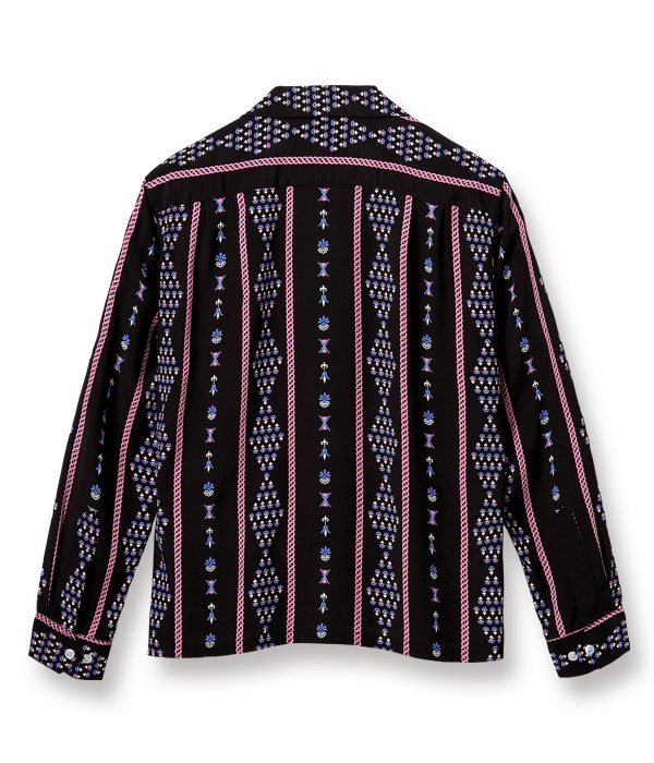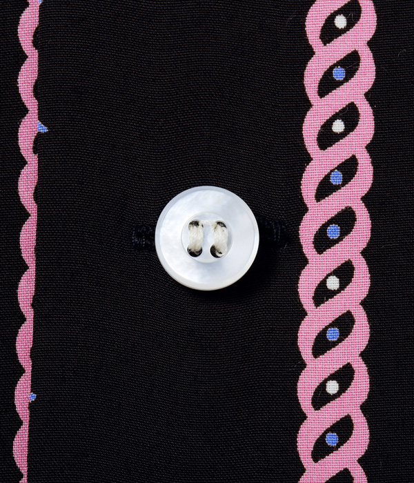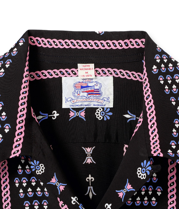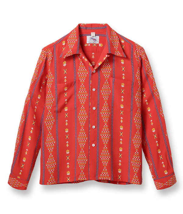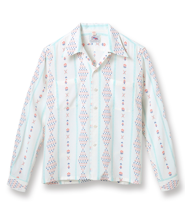 オリンピックでの活躍によって世界中にその名を知らしめたデュークは競技人生を終えた後、ハワイの認知度向上のために活動を始める。特に力を注いでいたのがアロハシャツの普及で、’49年には大手アパレルメーカー、シスコ・カジュアルズ社と専属契約を結んだ。今回紹介する一着は、’50年代後半に同ブランドから発表されたもので。幾何学的なモチーフをストライプに組み合わせたデザイン。’50年代に様々なアイテムに取り入れられたアトミックパターンと呼ばれる図案であり、時代を象徴する作品となっている。