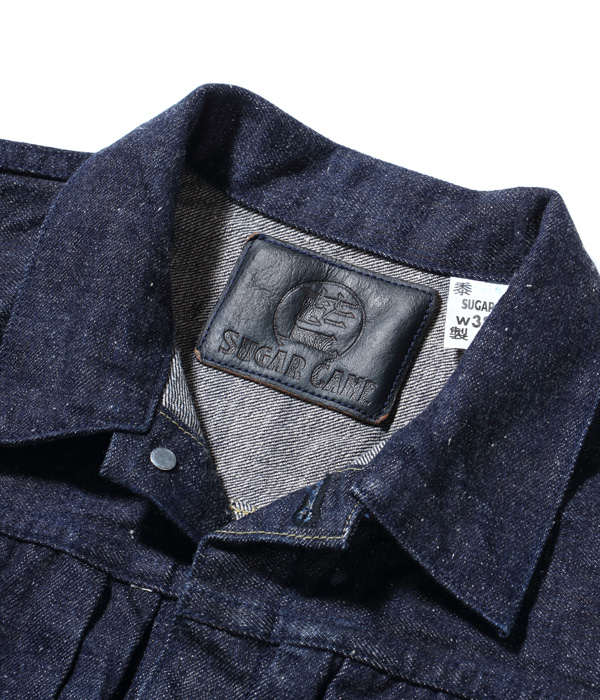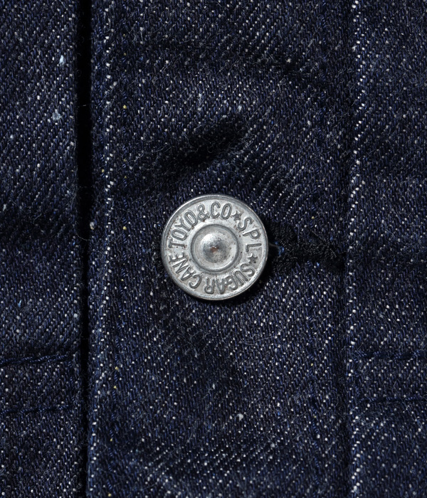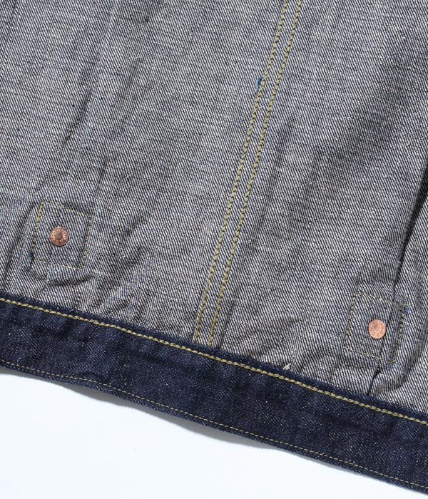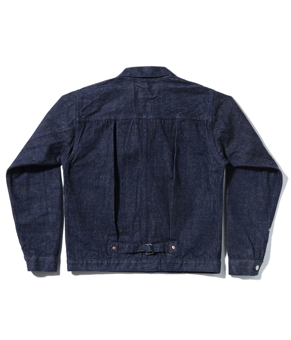 13オンスのコットン70%, 砂糖黍30%の新しく作製した、赤みが強くネップが特徴の阿波藍混デニム。型は1950年代初期まで存在した片ポケットの”TYPE-Ⅰ”(通称1st)がベース。本来ビッグサイズだけにしか採用されない「バックT」と呼ばれるセンターセパレート仕様を全サイズに取り入れている。ステッチはネイビーなので外観は落ち着いた仕上がり。ただし内側にはイエローステッチを使用というギミックを持つ。ポケットのフラップ裏はライトオンスデニムではなく、抜染プリントスレキを使用。柄の境目を中心に用いている。レザーパッチも鹿革製の本藍染め。