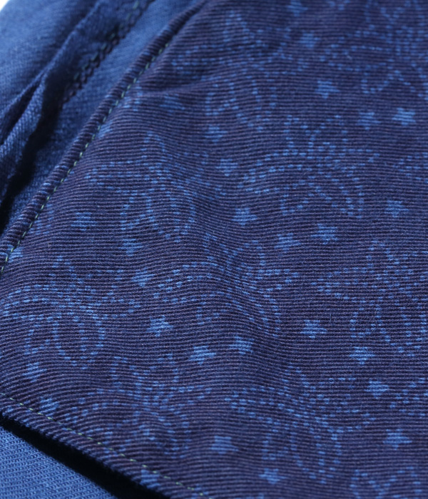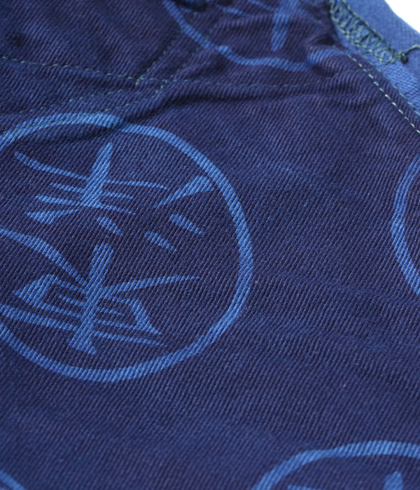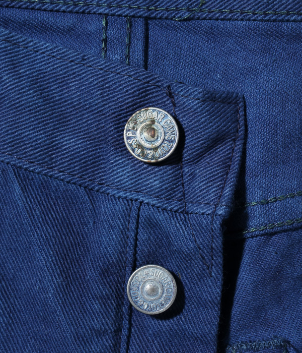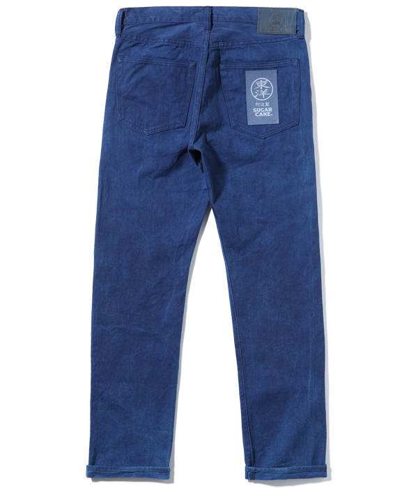 外側のステッチはネイビー、内側のステッチはイエローで縫製し、ジーンズに仕立てた後に本藍染めを行っている。通常、シュガーケーンでは縫製に綿糸を使うためイエローステッチも染まってしまうのだが、本作ではコアスパン糸を使用することでイエローの色味を残している。シルエットはスリムテーパードのモデルだが、ヴィンテージジーンズの仕様を踏襲しているため、ヒップポケット裏側のコンシールリベットやバータックなども省略されずに健在。インディゴ生地からプリント部分の色を染め抜く抜染(ばっせん)を施した特製のスレキも、本藍染めにより抜染部分がインディゴブルーに染まっている。左ポケットのスレキのモチーフは蓼藍の葉。右ポケットのスレキには東洋の文字が抜染プリントされている。