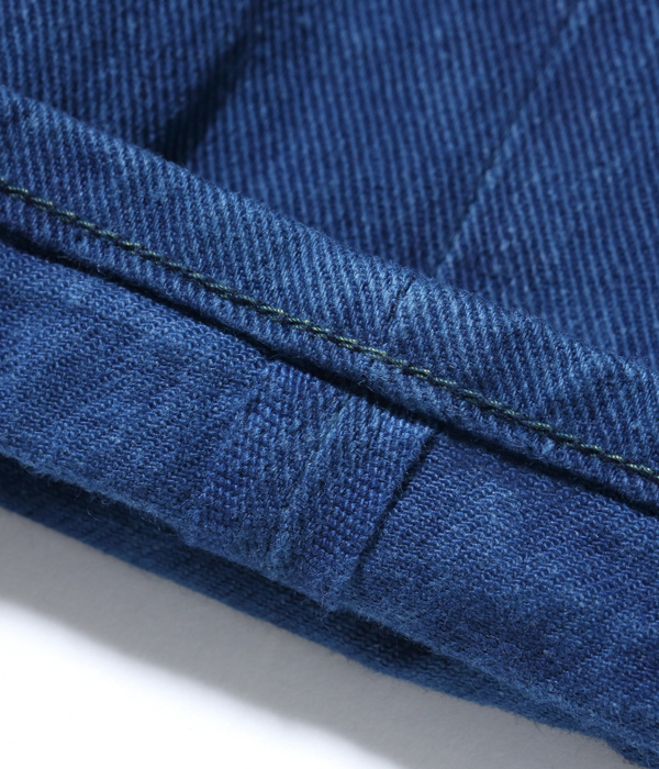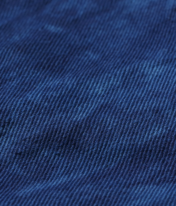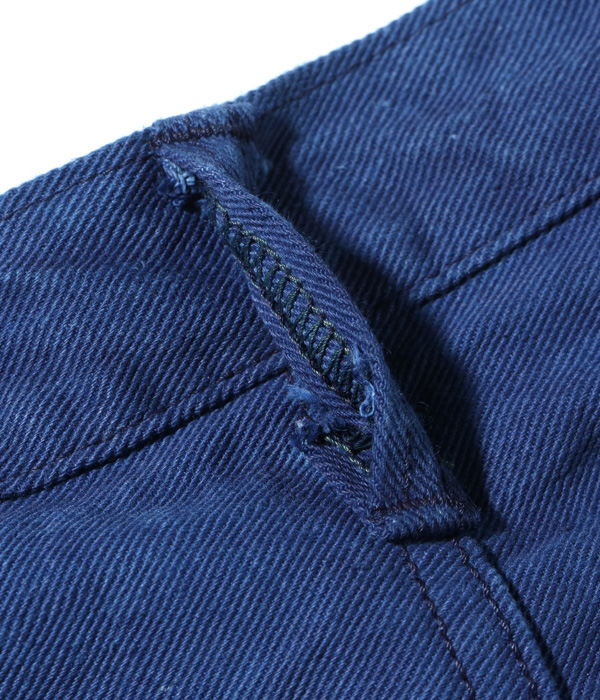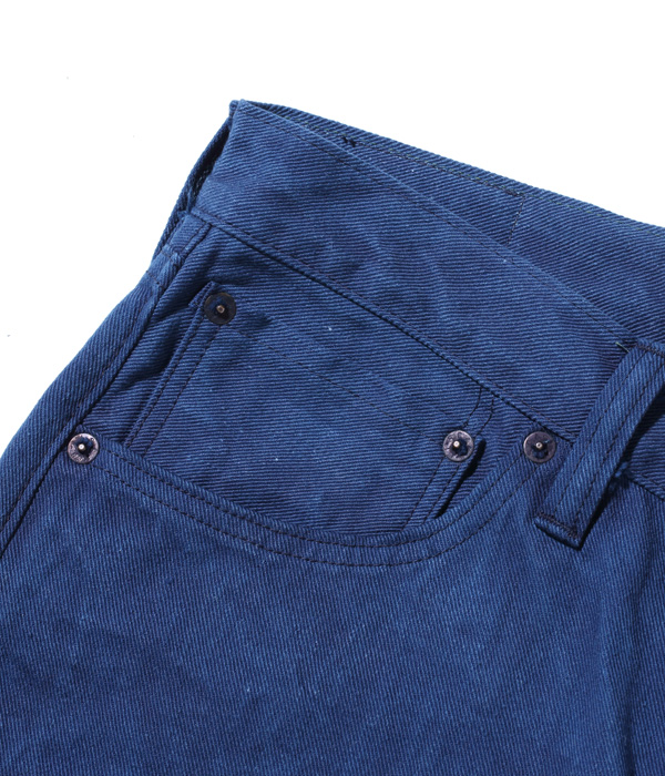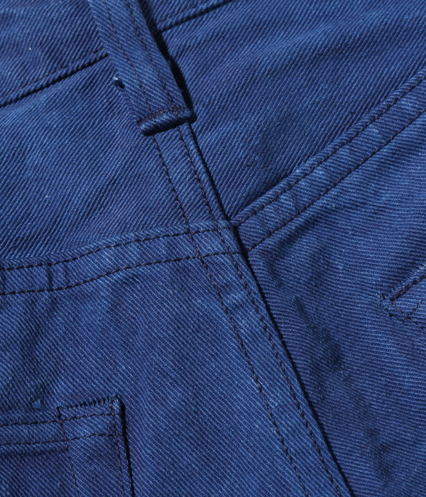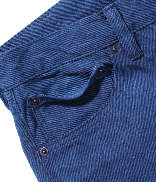 13オンスのコットン90%, 砂糖黍10%のホワイトデニムで5ポケットを製作し、徳島の藍工房にて江戸時代の「紺屋」に依頼したイメージで本藍染めした。染料には農薬不使用の畑で栽培された食用藍の葉を使用している。レザーパッチも鹿革製の本藍染め。シルエットはヒザ下からテーパードを効かせたスリムフィット。シルエットはオリジナルだが、縫製仕様やパーツ等のディテールはヴィンテージに準じている。