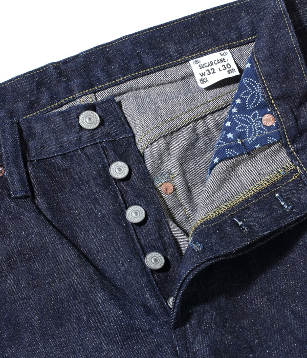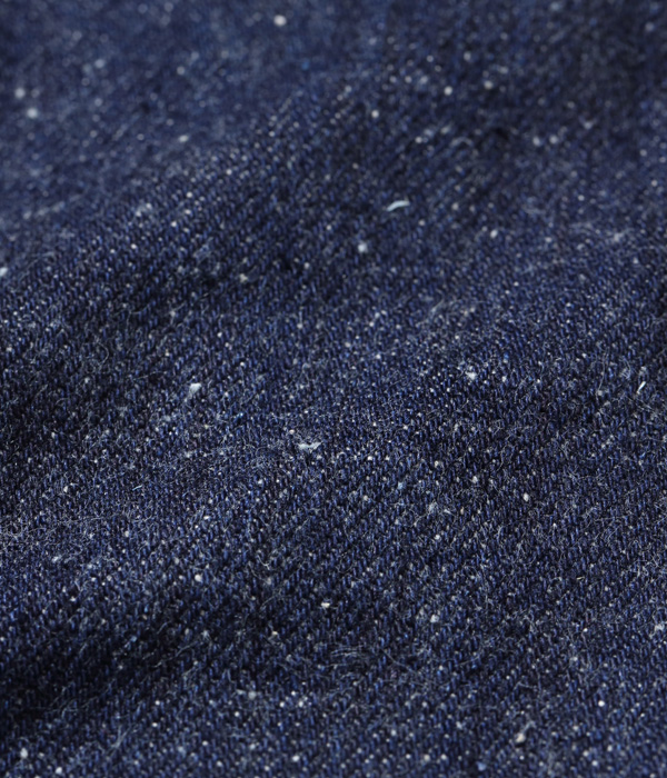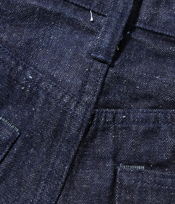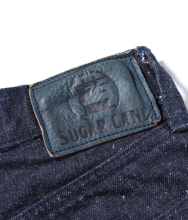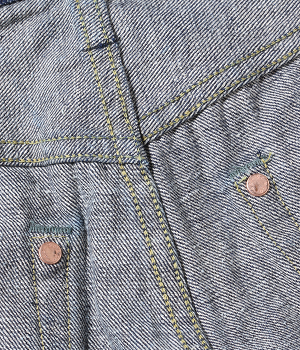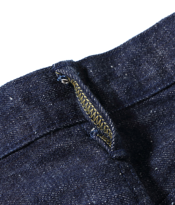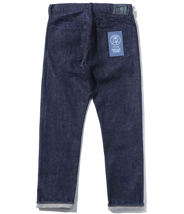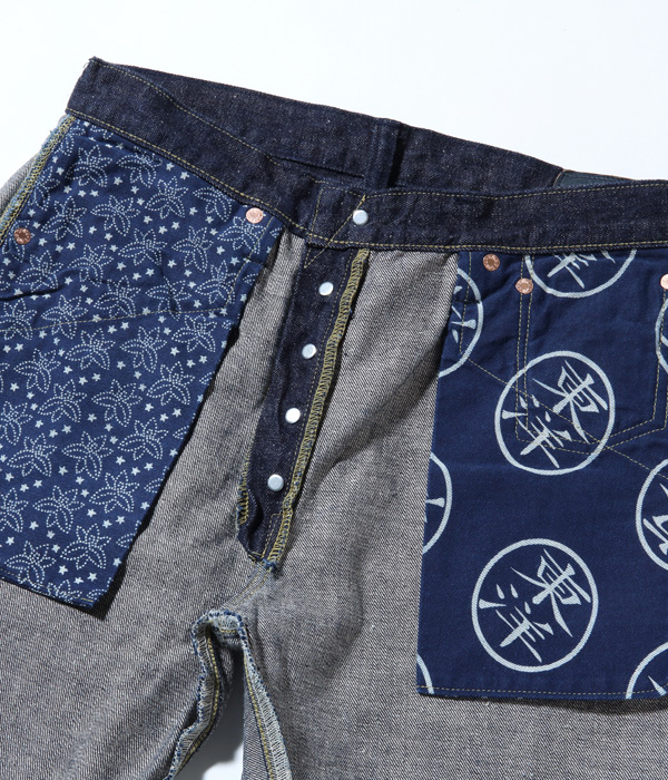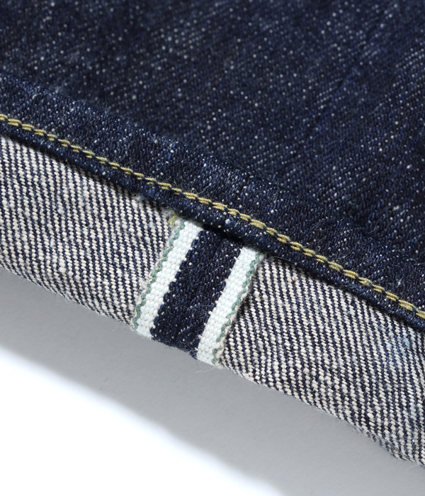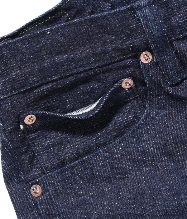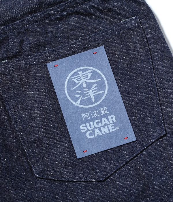 13オンスのコットン70%, 砂糖黍30%の新しく作製した、赤みが強くネップが特徴の阿波藍混デニム。シルエットはヒザ下からテーパードを効かせたスリムフィット。レングスは30インチと32インチの2種類から選べる。シルエットはオリジナルだが、縫製仕様やパーツ等のディテールはヴィンテージに準じている。ステッチはネイビーなので外観は落ち着いた仕上がり。ただし内側にはイエローステッチを使用というギミックを持つ。ポケットの袋地は、抜染プリントスレキを採用。右側は「東洋」柄、左側は藍の葉をモチーフにした総柄を使用している。レザーパッチも鹿革製の本藍染め。