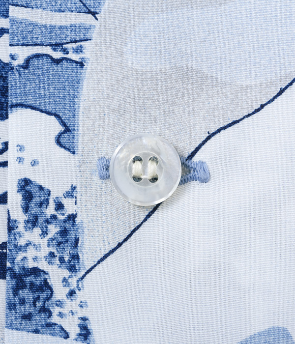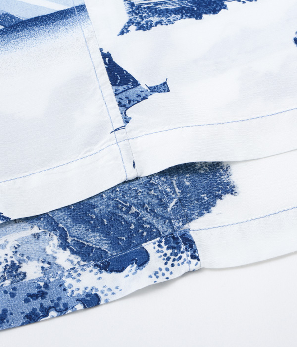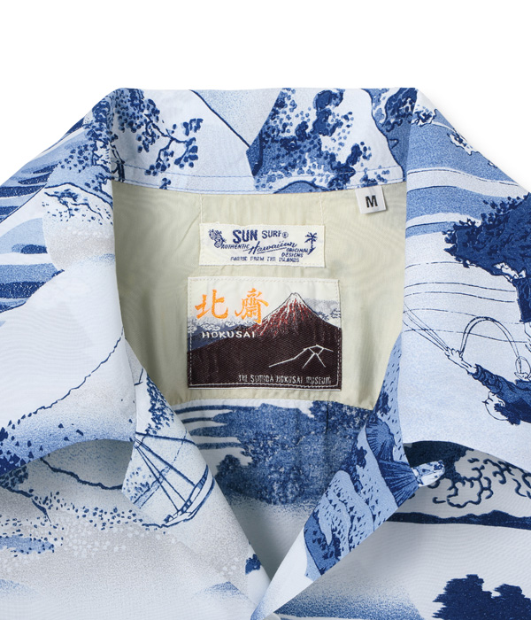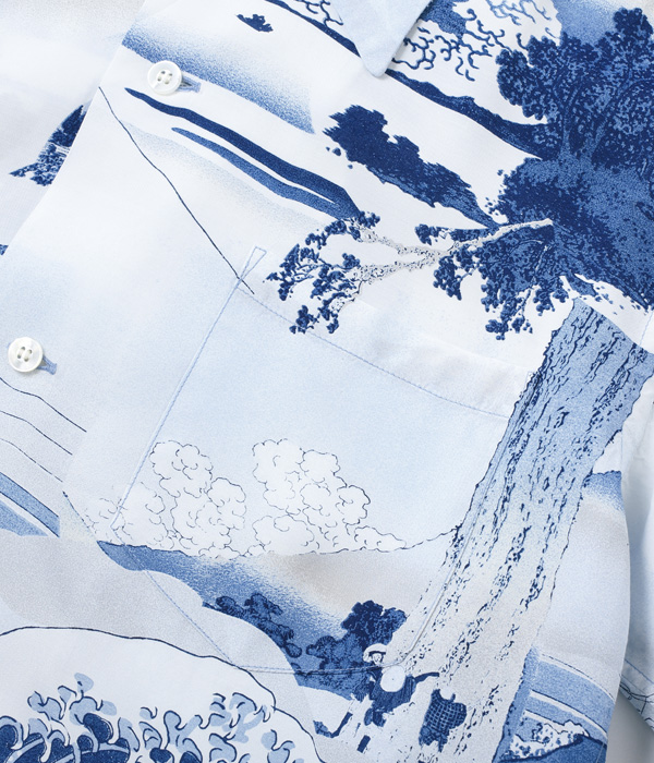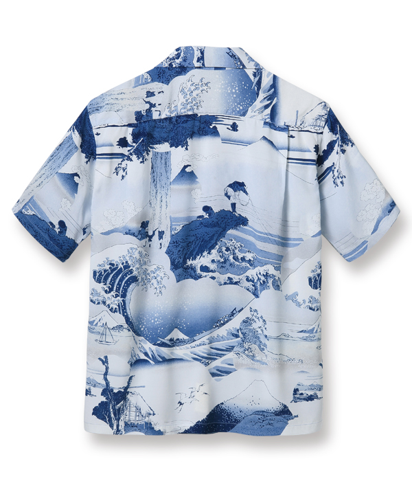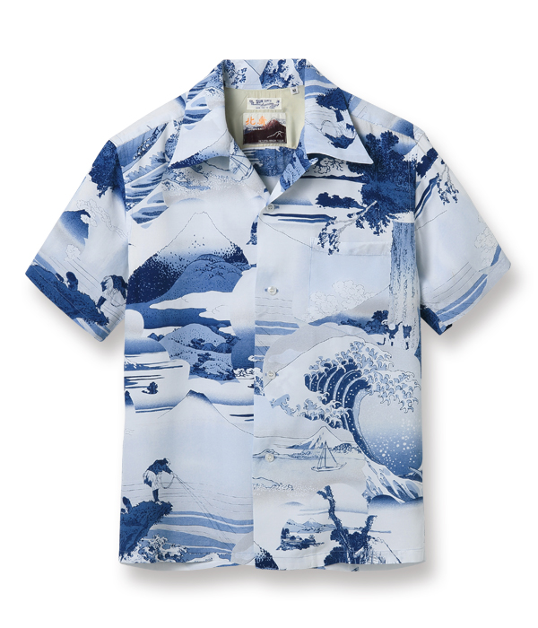 このシャツは、富嶽三十六景の46作品の中から藍摺絵(あいずりえ)と呼ばれるモノトーンの作品を中心に7つの作品を選び、ヴィンテージ・ハワイアンシャツに見られるピクチャー・プリント(複数の写真をコラージュしたデザインパターン)をイメージしてレイアウトした。北斎が自身の作品のこだわりとして使用していた「藍」をプリントに用いているのも本作の特徴。