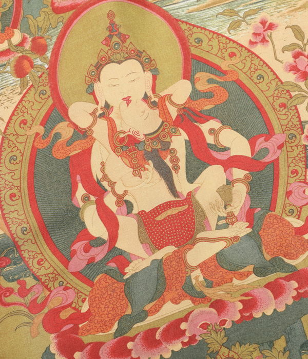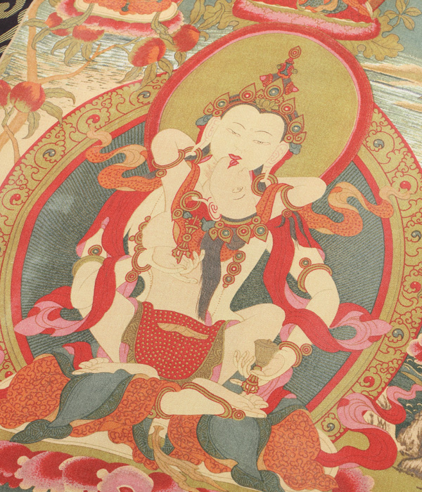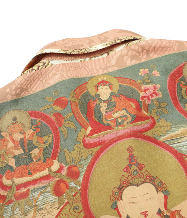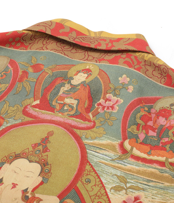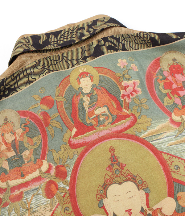 デザインの元となっているのは「タンカ」と呼ばれるチベット仏教の掛け軸。元々は僧侶が伝道の際に教義をわかりやすく解説するためのもので、この生地にもチベット密教の開祖である「パドマサンバヴァ」や男女両尊のシンボル「ヤブユム」など、チベットの仏教美術にみられるモチーフがプリントされている。作品名の「マンダラ」とは、サンスクリット語で円輪という意味を持ち、過不足のない充実した状態。悟りの境地を示す図絵でもあり、神仏が集会(しゅうえ)する「曼荼羅」として日本の文化にも伝存している。