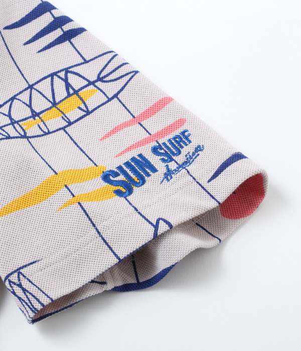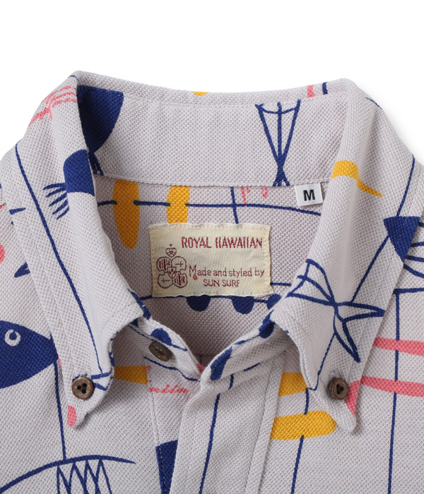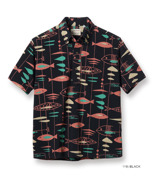 クールマックス®を使ったオリジナル鹿の子生地のハワイアンシャツ。体から汗を吸い上げ素早く蒸発させる。また生地の表面にコットン素材のみの層を作り、ヴィンテージ同様に抜染プリントで柄を染め抜くことで、クラシカルな外観と快適な着心地を両立している。